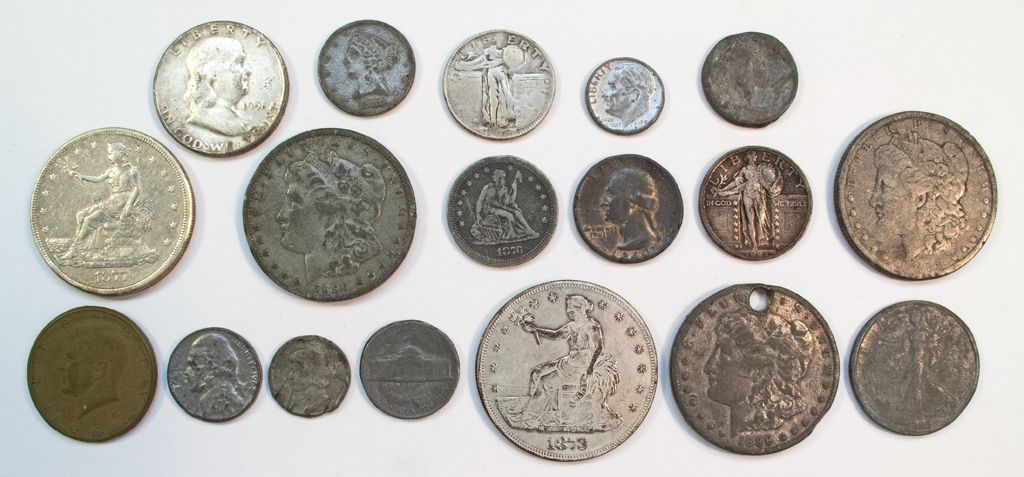 Interesting group of 18 coins, all US, mostly counterfeit. Some struck on other than original metal: a Kennedy half struck on clay, a $5 gold piece struck on base metal. The 1876-S 25 cent piece and the 1877-CC trade dollar may be authentic, but detective work needs to be done. A lot worthy of inspection.