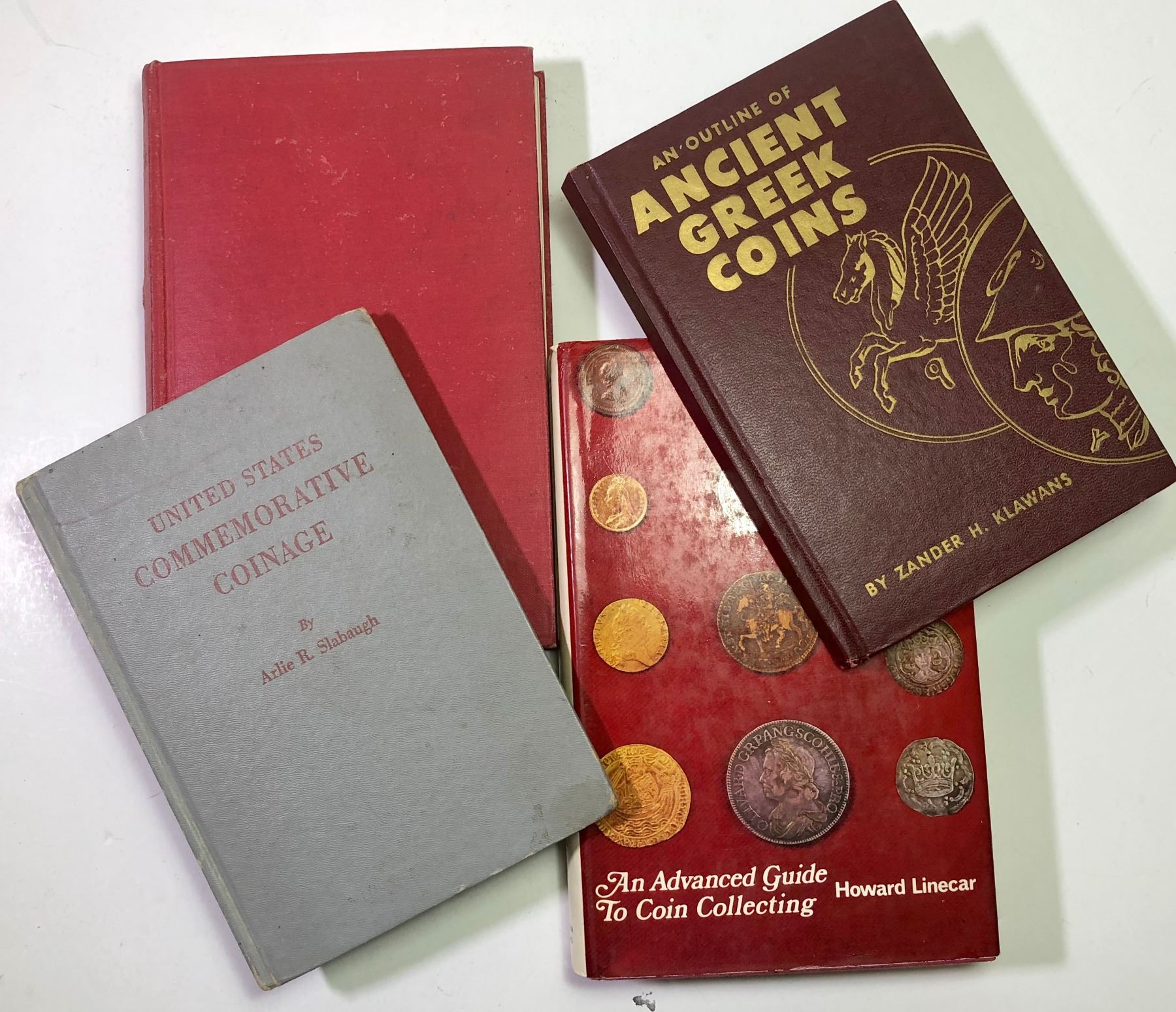 Hard cover An advanced guide to coin collecting by Howard Linecar, coins of Great Britain, Scotaland & Ireland (p.286 with duck cover); together with hard cover Ancient Greek coins by Zander H. Klawans (p.208) and United States Commemorative coinage by Arlie R. Slabaugh (p.144, pages a little water damaged); plus hard cover Seaby's Coin and Medal Bulletin, 1965 (p.363 plus photograph plates), (4 books)