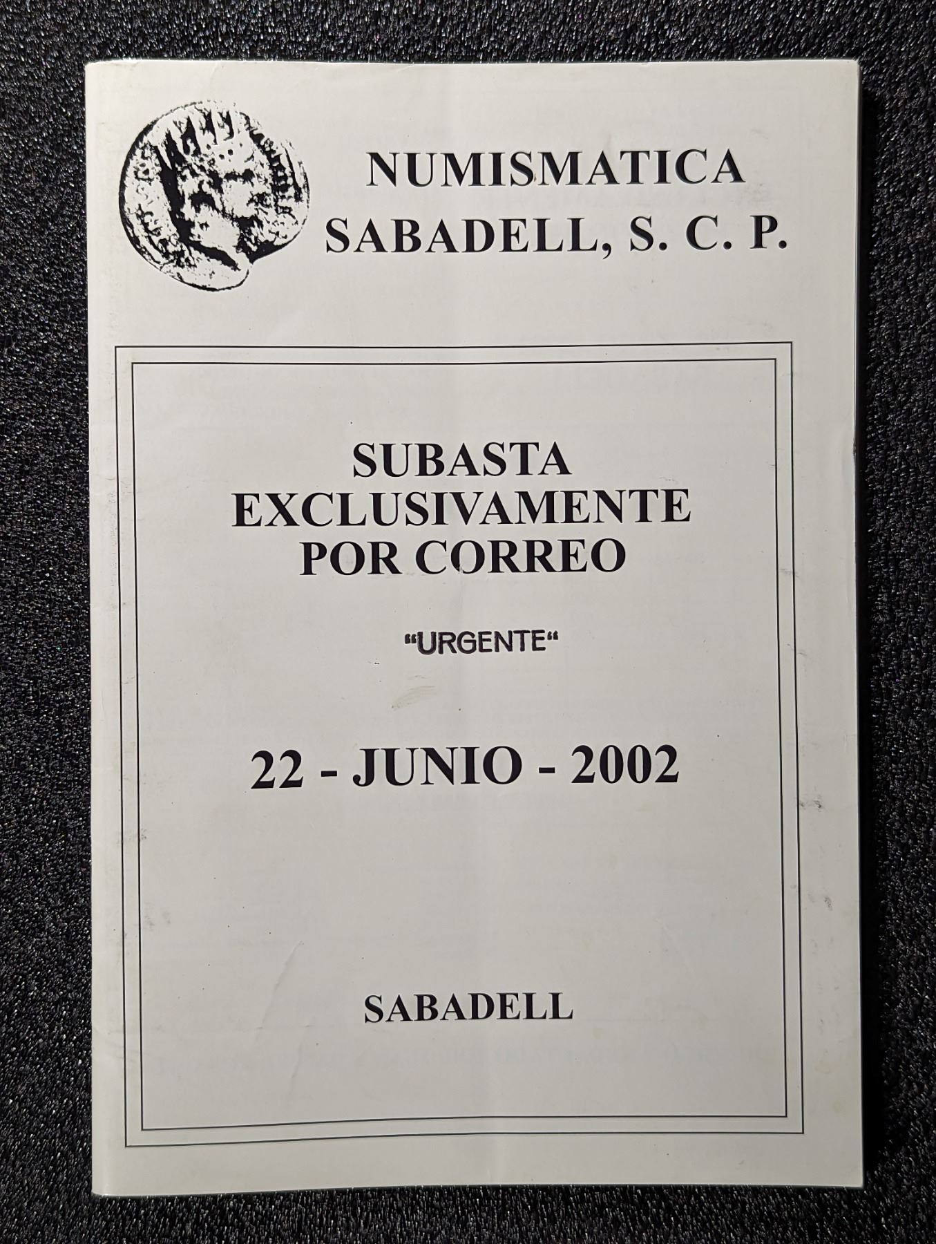 Numismatica Sabadell, S.C.P. SUBASTA. June 22, 2002. 8vo. 1-2248 Lots. Original pictorial card covers. Mail Auction Sale. Barcelona. 66 Pages. 18 b&w coin and medal plates. Fine. Lot weight: 0 lbs 5oz. Subject(s): Ancient, Spanish, Spanish American, World Coinage, Medals.