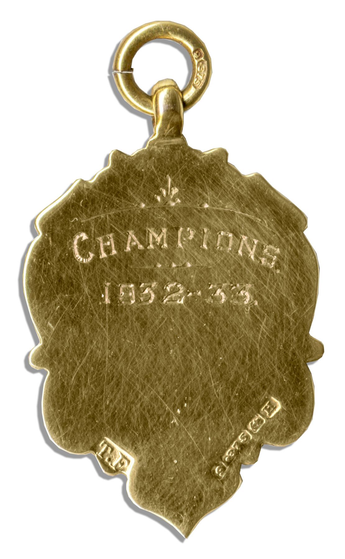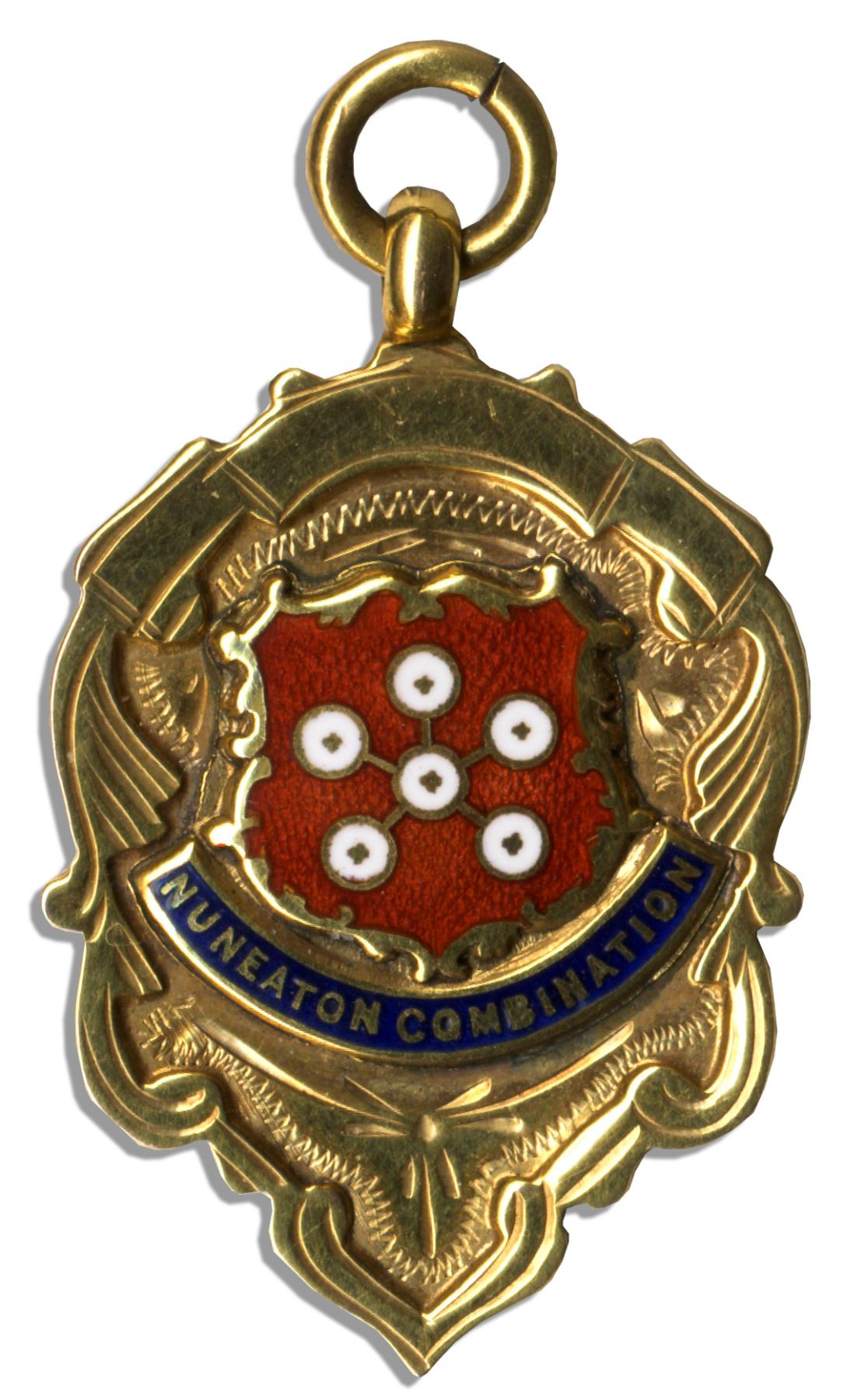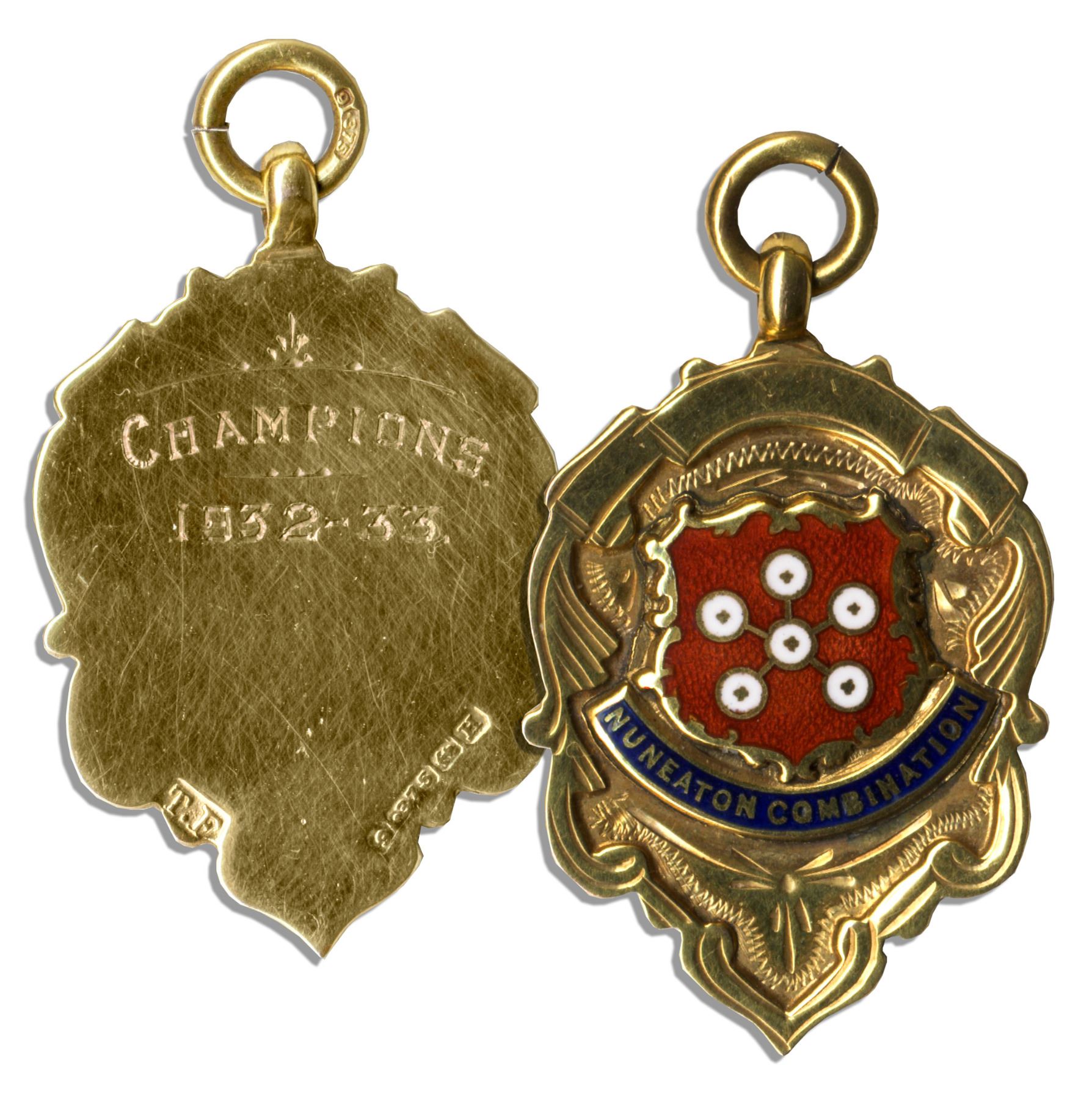 Solid 9K gold Nuneaton Combination championship football medal from 1932-33 season. Medal features a central crest and red inlaid logo with ''Nuneaton Combination'' written in gold against a blue strip. ''Champions / 1932-33'' and gold hallmarks are stamped to reverse. Measures 0.75'' x 1.25''. Weighs 3.8 grams. Near fine.