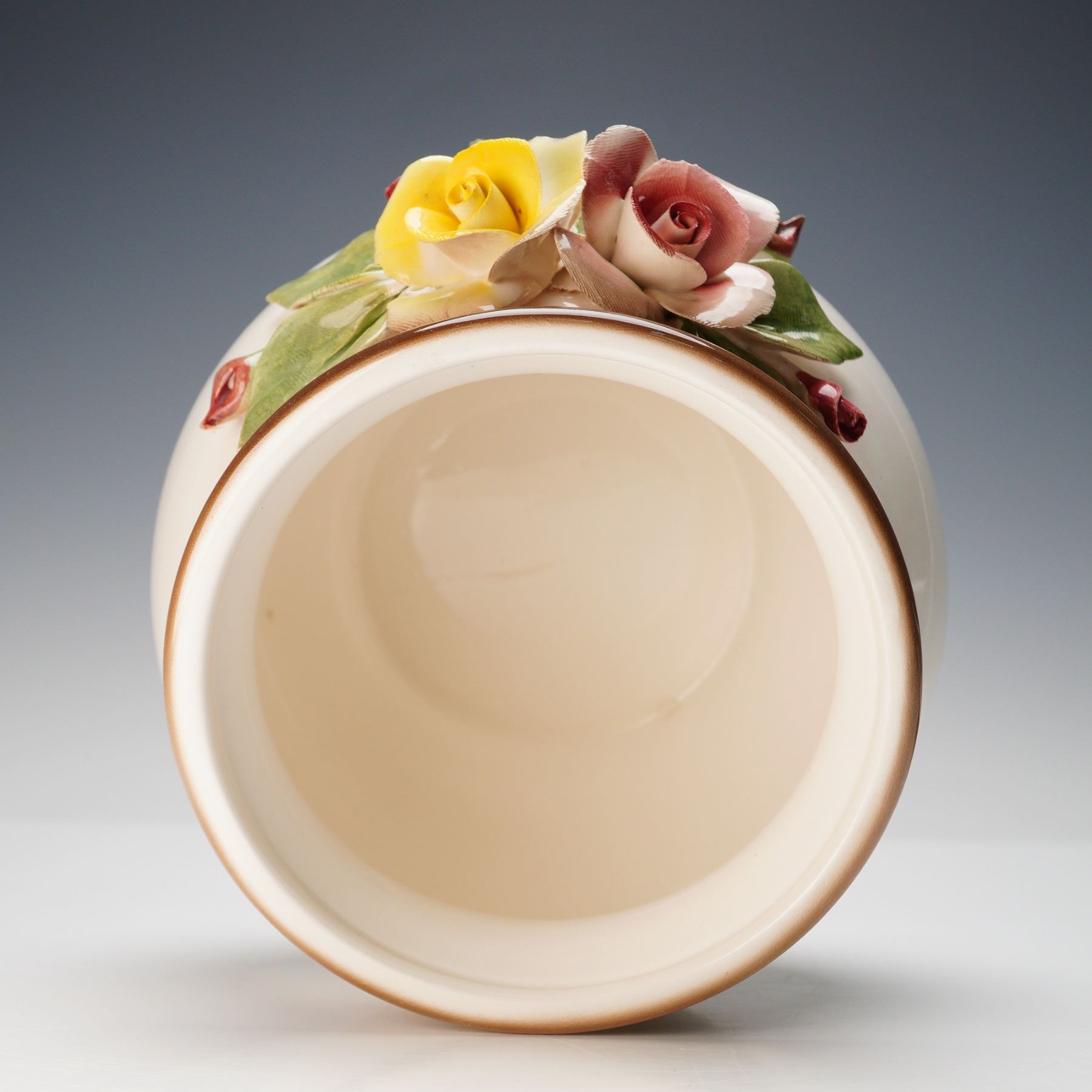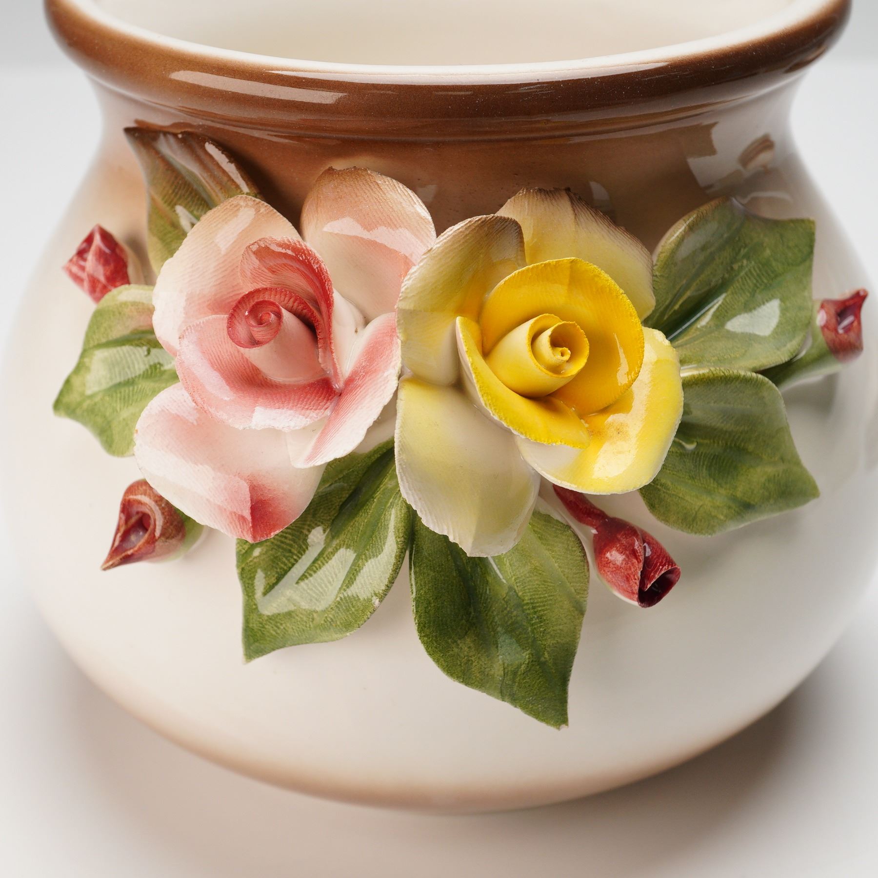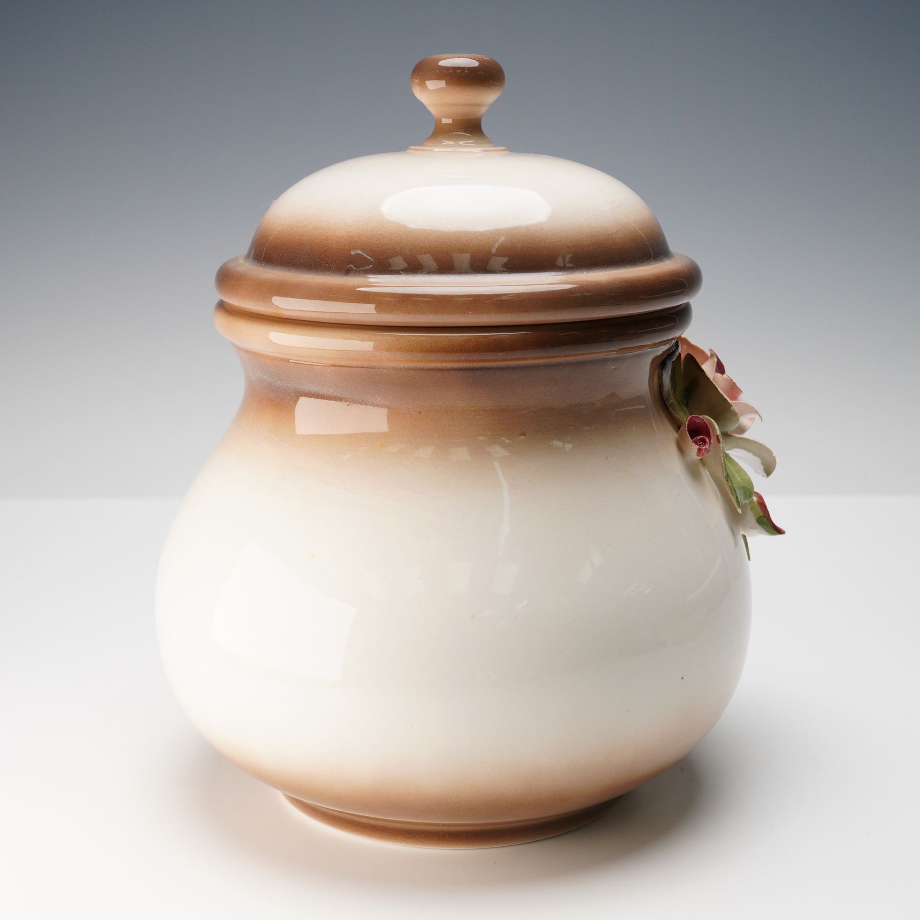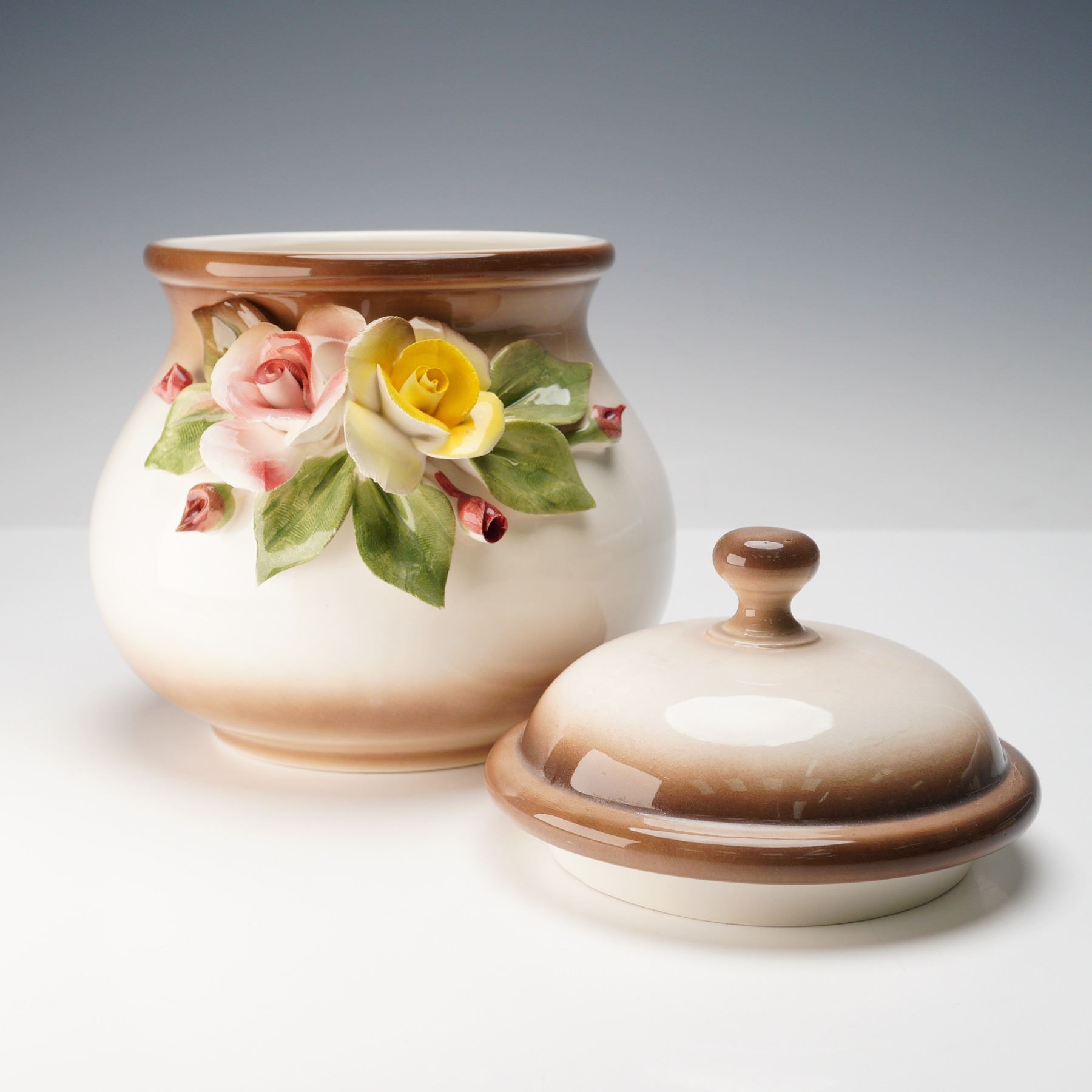 Elegant Italian ceramic jar featuring finely sculpted and hand-painted relief flowers in soft pink, yellow, and cream tones with lush green leaves. The jar displays a warm gradient glaze transitioning from ivory to rich brown and is topped with a rounded lid accented by a matching ombre finish. Marked on the underside with the blue Nuova Capodimonte back stamp and prancing horse logo. A graceful example of traditional Capodimonte artistry.