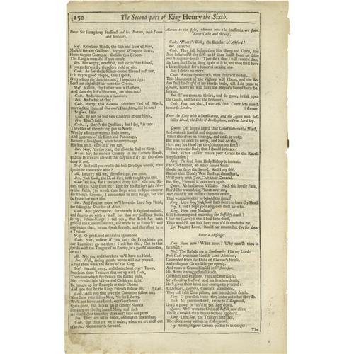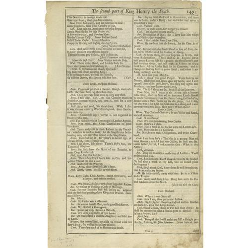<B>Two Early Book Leaves: Shakespeare's <I>Fourth Folio</B></I></B></I> <B>& <I>Nuremberg Chronicle</B></I></B></I> The first is a leaf from Shakespeare's Fourth Folio <I>The Second Part of King Henry the Sixth,</B></I> pages 149-150, 8.75" x 14". <BR><BR>The second leaf is from the <I>Nuremberg Chronicle,</B></I> one of the best-known early books, an illustrated world history. Circa 1493, in Latin, featuring eleven marvelous woodcuts, 12" x 17.75". Both in fine condition. From the Henry E. Luhrs Collection.