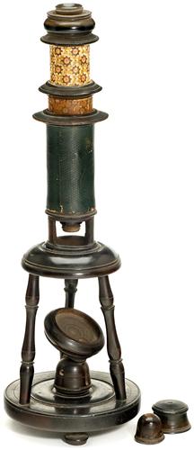 Nürnberger Holz-Mikroskop, um 1750 Hergestellt aus Holz und Pappe, Tubus mit koloriertem Papier beklebt. Spiegelhalter ohne Spiegel. Kleiner Riß im Holz. Mit Holzschutzkappen für Okular und Objektiv. Höhe: 34 cm. - Ein sehr dekoratives Exponat!