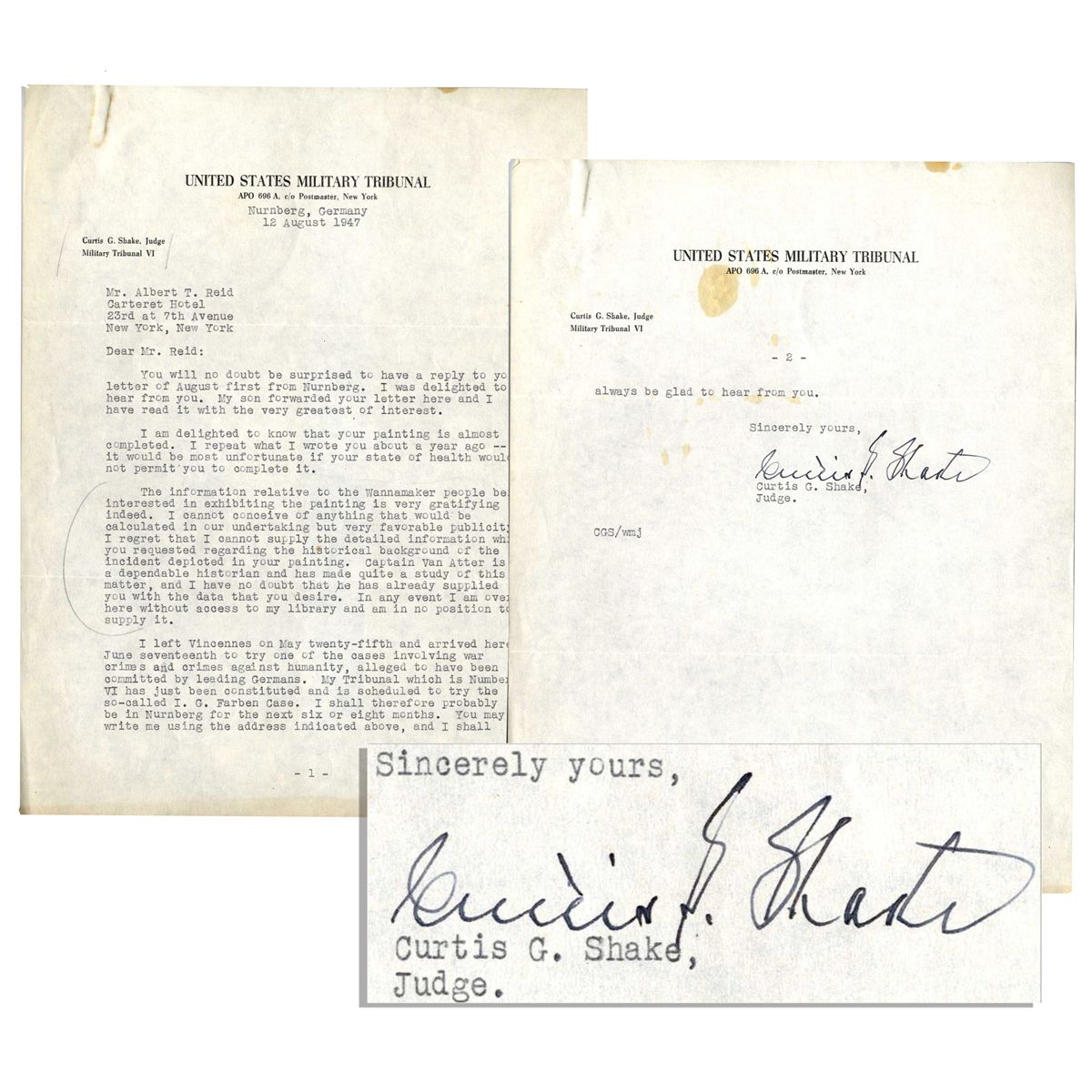 Typed letter signed by Curtis G. Shake, Judge for Military Tribunal VI, the sixth Nuremberg Trial. Composed on U.S. Military Tribunal stationery and dated 12 August 1947 from ''Nurnberg'', Shake writes to artist Albert T. Reid: ''…I arrived here…to try one of the cases involving war crimes and crimes against humanity, alleged to have been committed by leading Germans. My Tribunal which is Number VI has just been constituted and is scheduled to try the so-called I.G. Farben Case…'' 2pp. letter on two sheets measures 8'' x 10.5''. Very good.