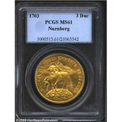 Nurnberg. Gold 3 Ducats ND (1703), KM262, MS61 PCGS, Lamb with PAX banner/Coats of Arms. A very rare multiple ducat, and an extremely handsome example. Important notice: We expect to be auctioning lots at the rate of 200-250 per hour. Sometimes eBay Premier live bid software cannot keep up with that pace, so we strongly recommend that you place a realistic proxy bid now as insurance to avoid disappointment. Also please note that all Heritage/CAA lots purchased through eBay Premier carry a 20% Buyer's Premium. Please make sure you read the Terms and Conditions.