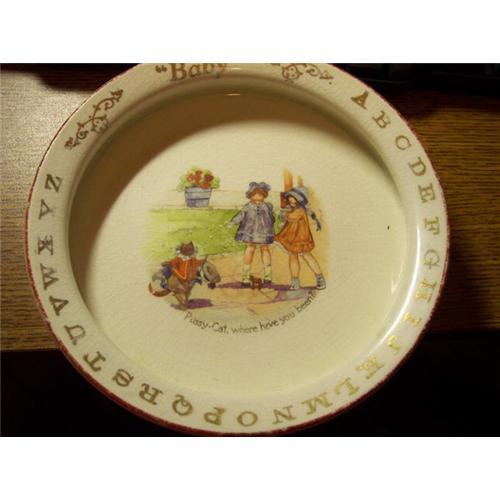Another darling baby dish with the Nursery Rhyme-Pussy-Cat,where have you been?-in the bowl and a darling picture.Some light wear to color around edge and very light crazing,otherwise fine.Measures 7 1/2" across.