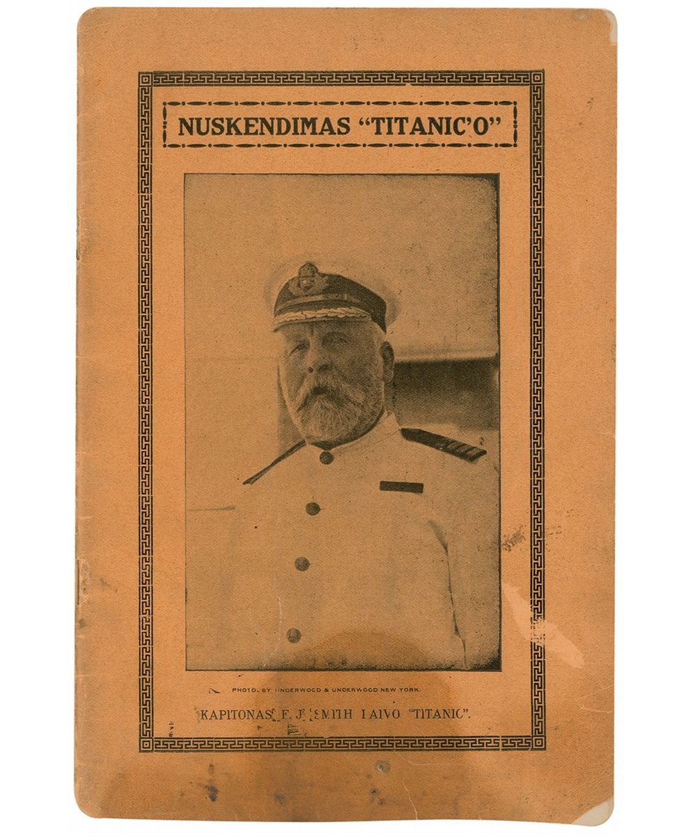 Uncommon Lithuanian booklet entitled Nuskendimas ‘Titanic’o,’ published in Worcester, MA, 1912, 17 pages, featuring a portrait of Captain Smith on the front cover. The last page is a large fold-out illustration of the Titanic sinking. In very good condition, with scattered creases and soiling, staining to the lower portions of the covers somewhat affecting appearance, some separation to the spine, and a few chips and tears to the covers.