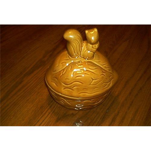 Featuring a ceremic, decorative,Covered, Nut Bowl. Designed as a large nut, with a squirrel for the handle. Measures 7 3/4 inches tall; measures 6 1/2 inches long by 5 1/4 inches wide; depth of bowl measures 2 inches; depth of lid measures 2 1/4 inches; base diameter of 4 1/4 inches long by 4 inches wide. Bottom embossed MADE IN CHINA. Excellent Condition.