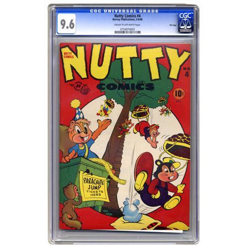 <B>Nutty Comics #4 File Copy (Harvey, 1946) CGC NM+ 9.6 Cream to off-white pages.</B></I> This is just the second issue of this funny animal book (which went from #1 straight to #4) and our offering is the only copy CGC has certified as of this writing. This is also one of Harvey's first attempts at funny animals, a genre they would come to specialize in with titles like <B>Baby Huey</B></I> and <B>Felix the Cat</B></I> in the next few years to come. Overstreet 2006 NM- 9.2 value = $55. CGC census 2/06: 1 in 9.6, none higher.