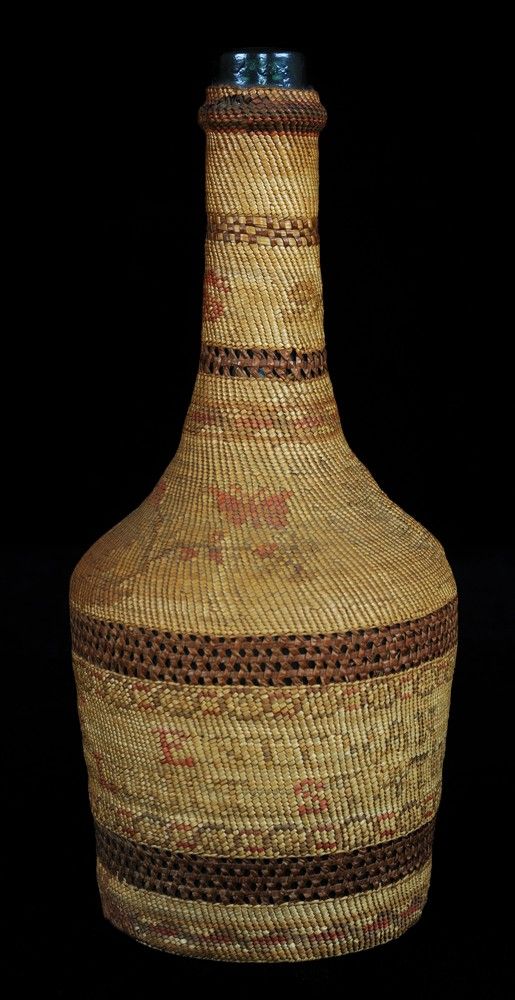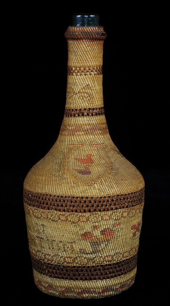 Nuu-chah-nulth Basketry Covered Bottle with Butterfly, Floral and Estevan Light Station Design 10 3/4" H. 5" D. Good Condition