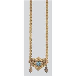 19. sz. közepe, antik arany, fantázia szemes lánc közepén kagylós virágos középtagban 5 db türkiz és 1 db gyöngy dísszel, csüngo hiányzik, nyelves záródással, 13,9 g