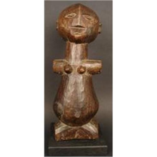 Late 19th to Early 20th century Nyamwezi puppet. Very well patinated and made of a very hard wood. This was an articulated puppet that has lost its arms and legs. Such puppets may have performed at an elder's funeral, with a relative speaking "through" the puppet, recounting the life and deeds of the recently deceased. See "From Ritual to Modern Art: Tradition & Modernity in Tanzanian Sculpture" (2001), pg. 11, figure 6 for a related Sukuma puppet. (The Sukuma are contiguous neighbors of the Nyamweze peoples, and share many artistic traditions with them.) 9 inches, 23 cm. From a renowned and published New York collection.