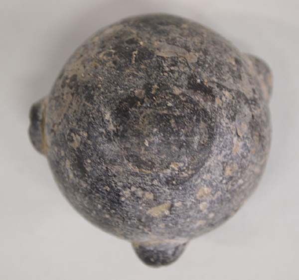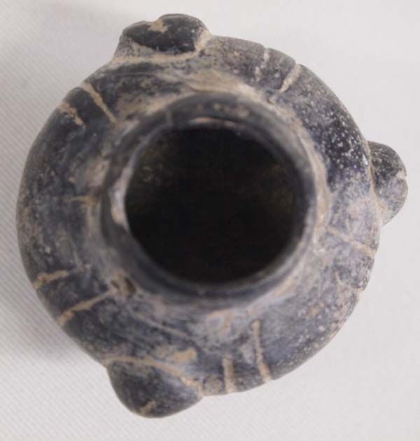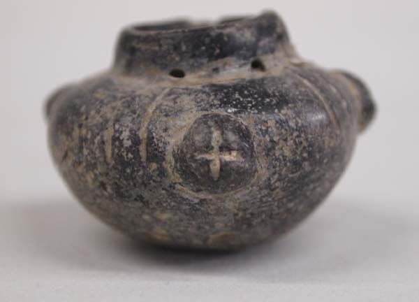 Nyarit Precolumbian Miniature Pottery Jar 500-1000 A.D., 4 handles, 3 directional crosses etched on handles, drill holes under rim, measures approx. 1'' x 2'', Acquired in accordance with all State and Federal Regulations, phenomenal find!