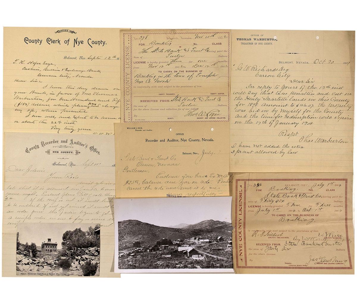 Lot of 8. These documents are from the courthouse. 1. Unused photo postcard. "Historic Abandoned Court House at Belmont (Nye County), Nevada." Dist. by Theron Fox, San Jose, California. 2. Reproduction photo of bird's eye view of the town. U.S.G.S. 1915. 3. Bank money withdrawal correspondence from T. H. Wells to T. R. Hofer, Esq.. at the Bullion & Exchange Bank in Carson City, September of 1889. Letterhead from the "Office of County Clerk of Nye County." 4. Business correspondence from the County Recorder and Auditor's Office of Nye County, Belmont, Sept. 11, 1883. 5. Nye County License for a one month license to bank in the town of Tonopah, Nov. 10, 1902 signed by Thos. W. Logan. 6. Business correspondence from the Office of the Recorder and Auditor, Nye County to State Bank & Trust Co. in Carson, July 7, 1903. Is stamped "The State Bank And Trust Co. PAID Carson, City, Nevada, July 12, 1903". 7. Nye County License for three months of banking for the State Bank & Trust Co., July 1, 1904. 8. Business correspondence from the office of Thomas Warburton, Treasurer of Nye County to G. W. Richards, Oct. 20, 1899.