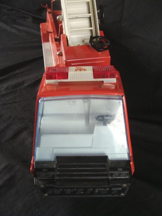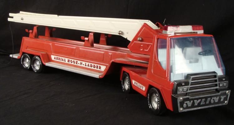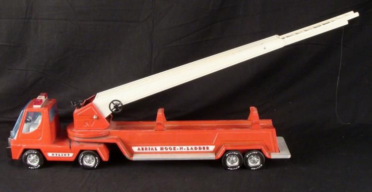 This vintage Nylint toy fire engine is red, and ready for your emergency adventures, or your collection.Condition: Very Good Model: Aerial Hook-N-Ladder Size: 30" long and 7" tall Metal with plastic ladder, wheels and windows Ladder mechanism raises but does not extend Made in USA *