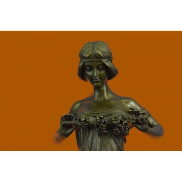 Nymph Of The Woods Bearing The Bounty Discovered On A Morning Lark In The Italian Countryside, This Beautiful Maiden Walks Into Our Imaginations As A Classic Art Nouveau Sculptural Figurine. Artistically Sculpted From Her Stylish Headdress To The Soft Drape Of Gown Across Her Slender Body. This Brown Patina Sculpture Was Cast Using The Lost Wax Method And Mounted On A Marble Base. Bronze dimensions with marble base: Height 14 X Width 5 inches. Weight: 7 lbs.Please Note: This is a reproduction bronze sculpture from the original molded and signed. This featured bronze sculpture is a recast after the original, and has been done recently. This 100% bronze sculpture is an abstract piece certain to be a conversation piece.Please Note: This is a reproduction bronze sculpture from the original molded and signed. This featured bronze sculpture is a recast after the original, and has been done recently. This 100% bronze sculpture is an abstract piece certain to be a conversation piece.