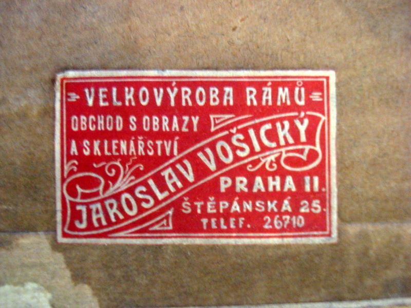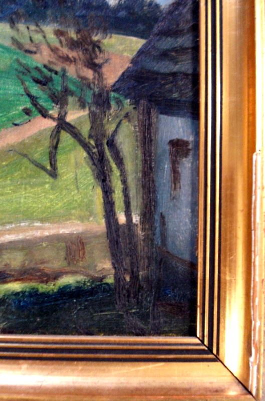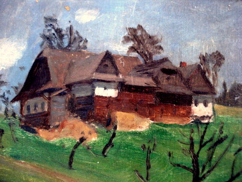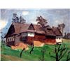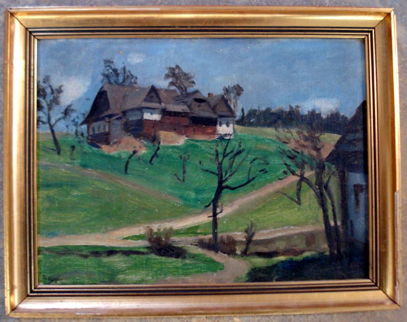O/B Landscape with a farmhouse on a hill, signed illegibly. Mid 20th C, Czech Republic paper label o