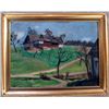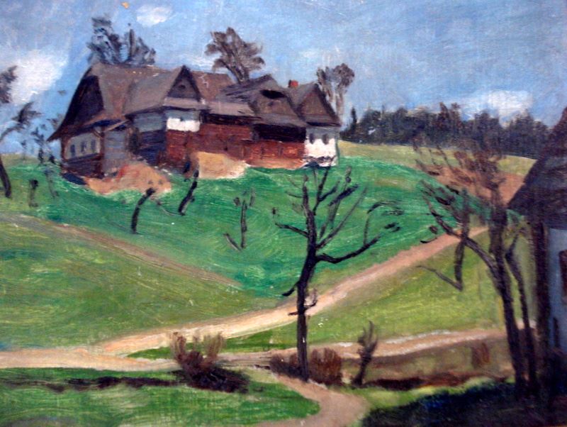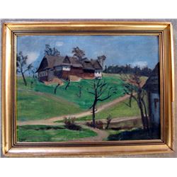O/B Landscape with a farmhouse on a hill, signed illegibly. Mid 20th C, Czech Republic paper label on back.(9" x 12.5")