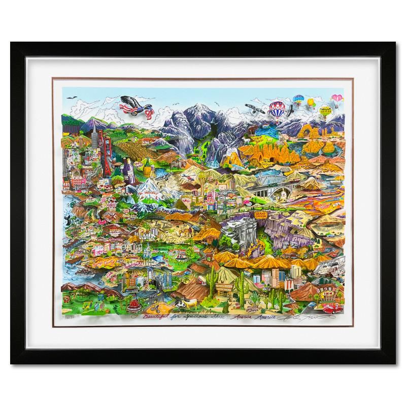 "O Beautiful for Spacious Skies" is a 3D limited edition silk screen construct on paper by Charles Fazzino, DX numbered and hand signed by the artist. This piece comes custom framed. Includes Certificate of Authenticity. Measures approximately 33.5" x 39.5" (framed), 24" x 30" (image).