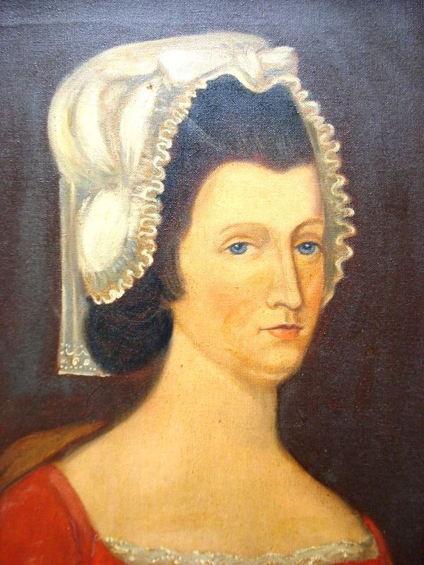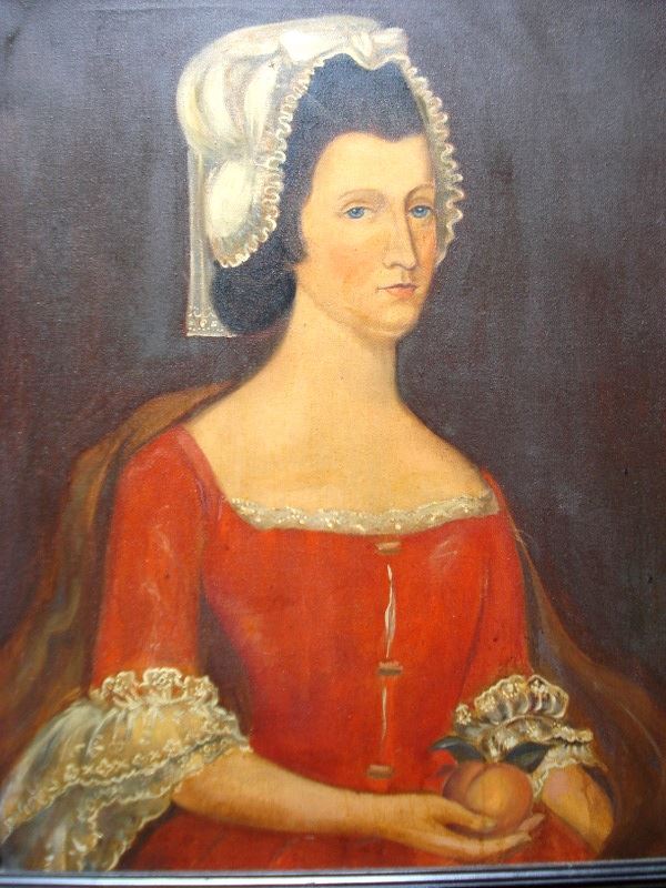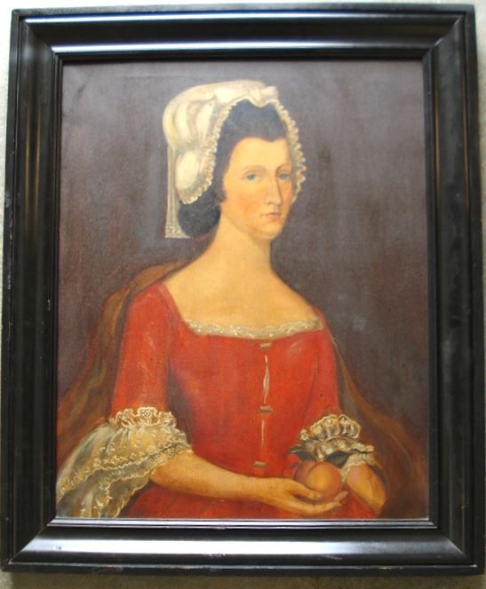 O/C Folk art portrait of an 18thC woman in a red dress holding a peach, executed at a later date. 24