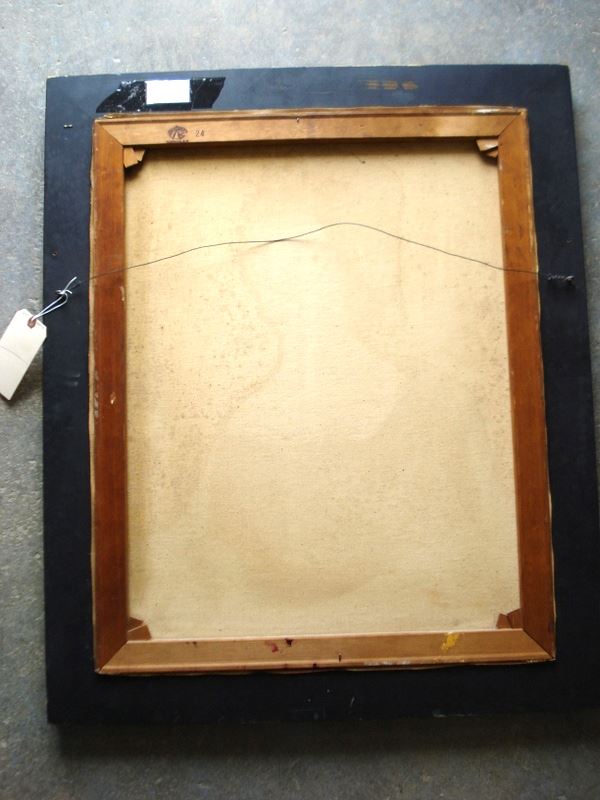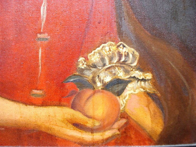 O/C Folk art portrait of an 18thC woman in a red dress holding a peach, executed at a later date. 24" X 30". Probably early to mid-20th century.