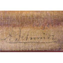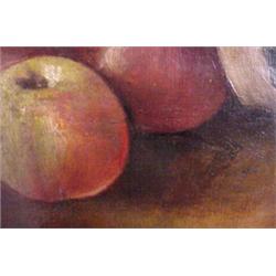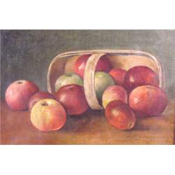 Oil painting on canvas of still life with fruit tumbling from a basket; signed lower right but illegible; Ca. 1900; three repairs with in-painting; patches are visible from reverse; repairs include "V" shaped tear at lower center extending into apple; mounted in repainted old frame; s.s. 17.25" wide x 14.5" tall