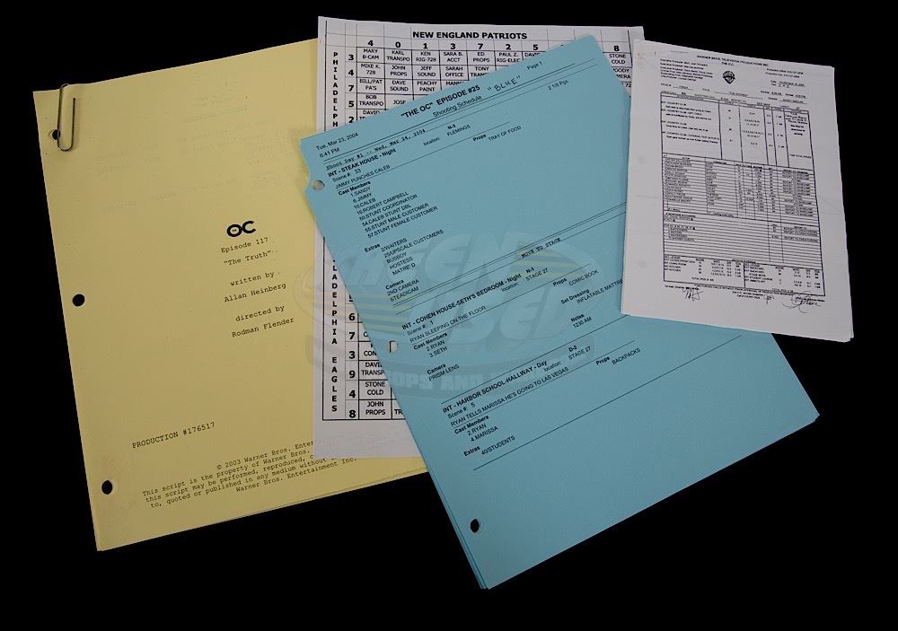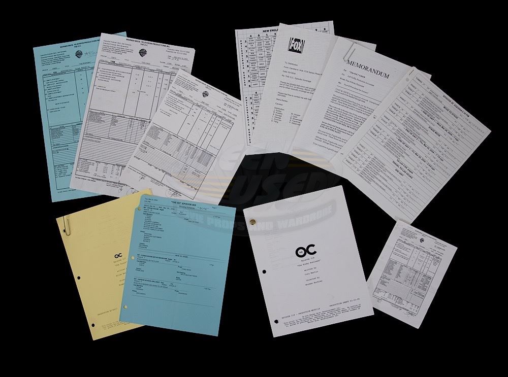 (Warner Bros., 2003-2007) This collection of production paperwork consists of a script for episode number 218 titled "The Risky Business", several script revision pages for episode number 117 titled "The Truth", eight page shooting schedule for episode number 25, a crew memorandum concerning payroll procedures for season three, with attached forms and instructions, a one page football pool sheet, a one page memo concerning the set photographer, two double sided call sheets and two call sheets with attached script sides for the days shoot.