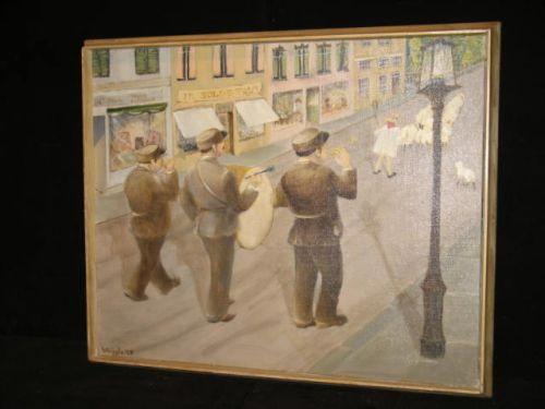 O/C, Three Man Band, signed Whipple, dated 1965, Jour de Soigner and Luxembourg 64 on back, 17.75" x 21.75".