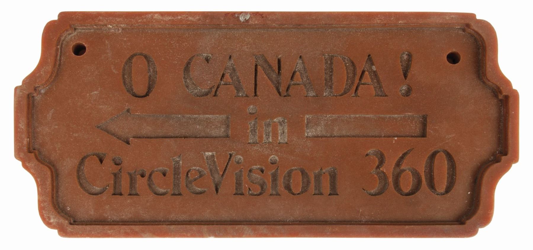 (Epcot, 1980s) A small sign created for Epcot's film "Oh Canada!" which played in the Circle-Vision 360 theater at the Canada Pavilion. Created in thick resin, this sign would point guests towards the theater entrance. Measuring 7.5"x15.5" and 1" thick, the sign is in good condition overall with minor surface wear throughout, including some dried adhesive on the top edge.