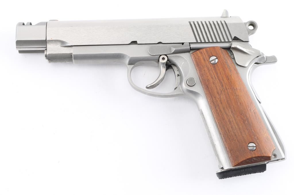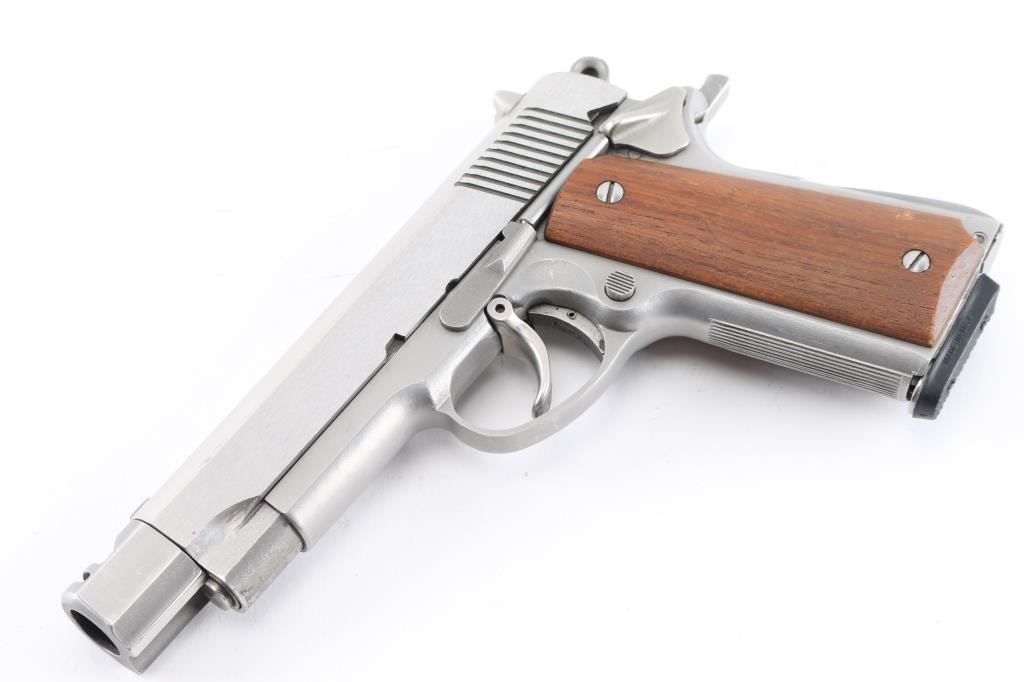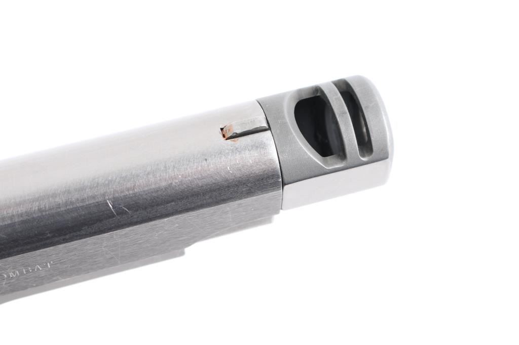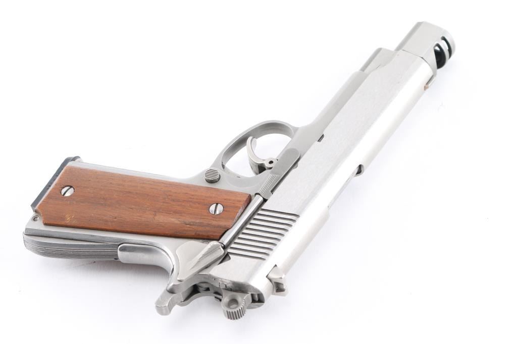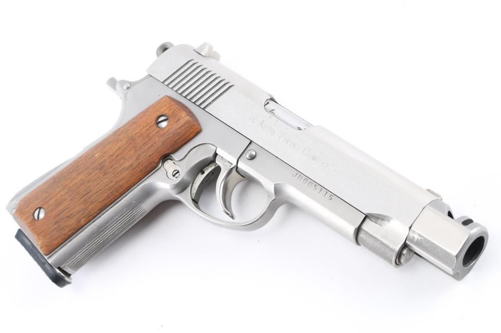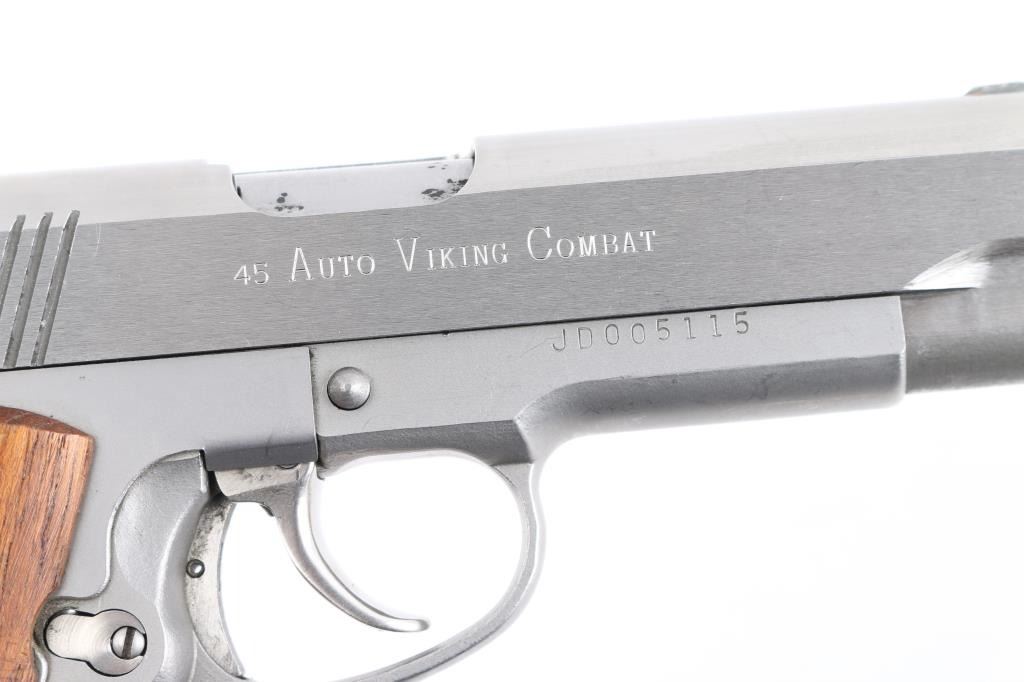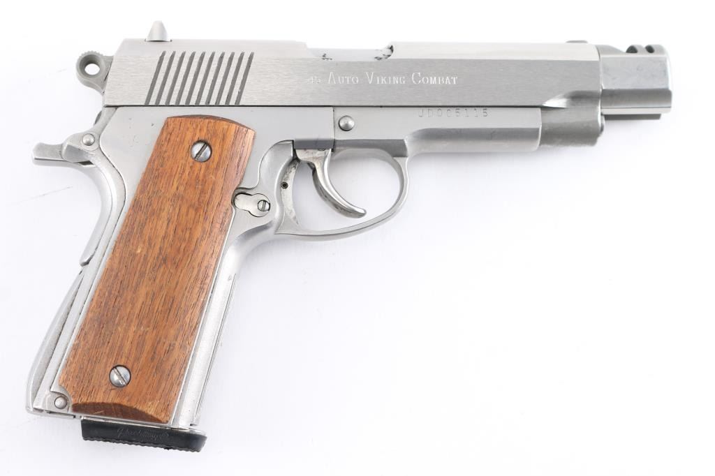 One of only approximately 300 made. The ODI Viking Combat is the only 1911 style pistol built using the Seecamp double action trigger system. This pistol features a Commander sized slide and frame with a serrated arched mainspring housing and serrated front strap with the interesting trigger system. The mechanism appears to use a more traditional double action trigger to cock the hammer. Once cocked, the trigger presses against an extra short traditional 1911 trigger to release the hammer and fire the round. Ported muzzle break installed in the bushing on the front of the slide, grip safety, smooth wood grips, stainless slide with matte stainless frame, fixed sights. No magazine, accepts standard 1911 magazines. "ODI, which was based in Midland Park, New Jersey, began manufacturing stainless .45 autos with the Seecamp conversion installed sometime in the early '80's. Bore is excellent/bright, the action is smooth, grips are very good with some minor blemishes and the stainless finish is overall very good with some scratches. A scarce pistol.