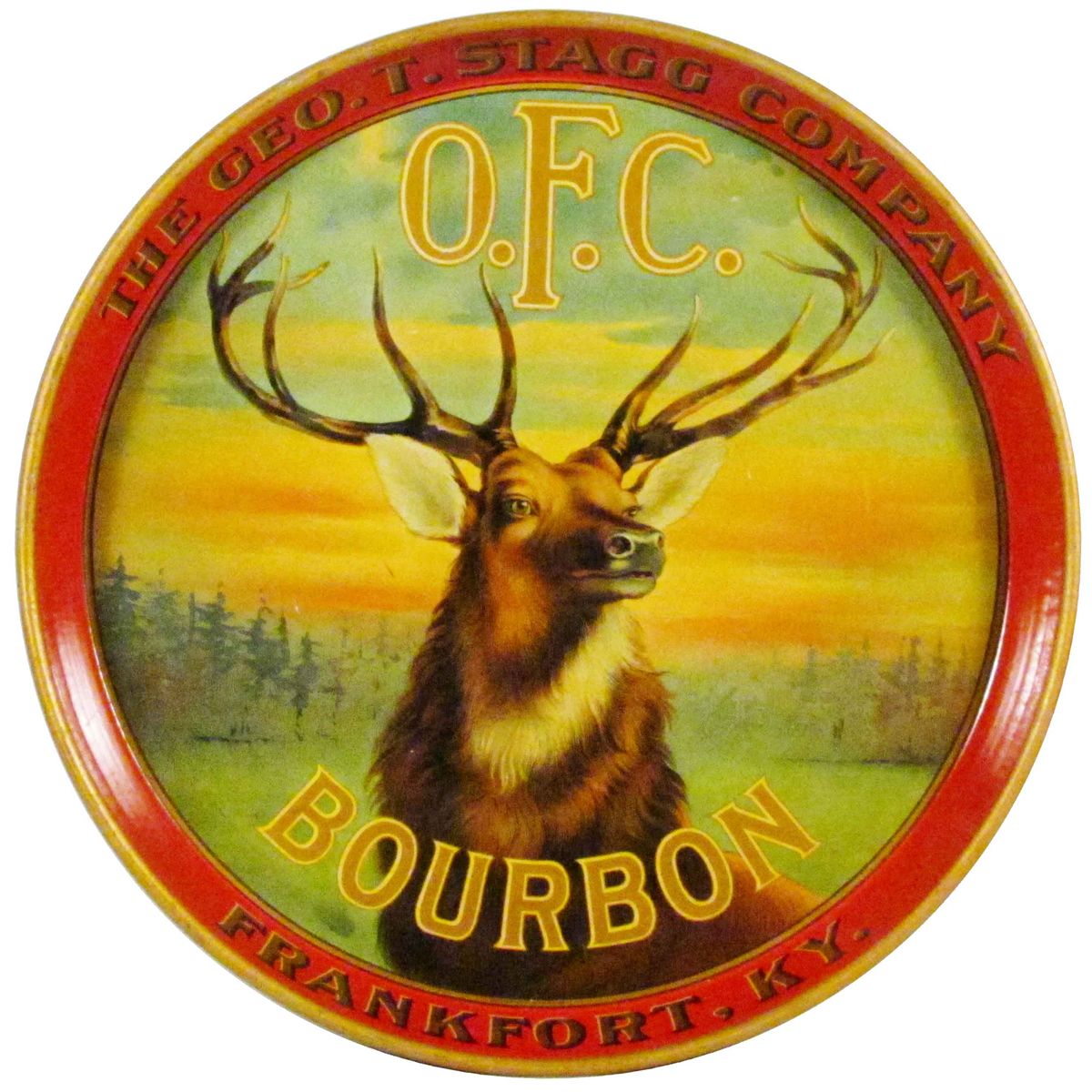 O.F.C. Bourbon Tin Serving Tray. Depicting Stag. Haeusermann NY Lithographer. Excellent condition. 12 inch diameter.