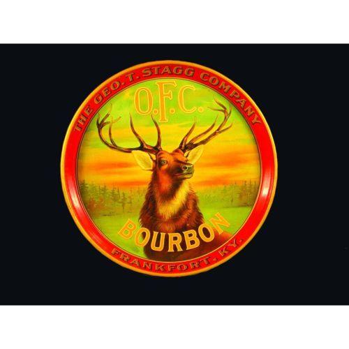 O.F.C. Bourbon Tin Serving Tray, The Geo. T. Stagg Co., Frankfort, KY, excellent condition, 12 inch diameter.