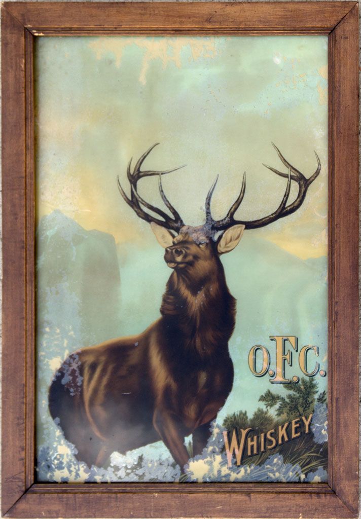 c1900 - Large framed advertising picture featuring a majestic Elk, with the O.F.C. Logo. The frame measures 24"x36". The O.F.C. distillery was near Leestown KY. OFC stood for "Old Fashion Copper," with the copper being an integral part of the distilling process. It was supervised by the legendary Col. Edmund H. Taylor, whose name was synonymous with whiskeys of the highest quality in the late 1800`s. OFC later joined with Kentucky River Distillery (formerly called Carlisle), owned and operated by Geo. T. Stagg County. Their products were known as Stagg`s Elkhorn. The facilities would eventually became the famous Ancient Age. -61164