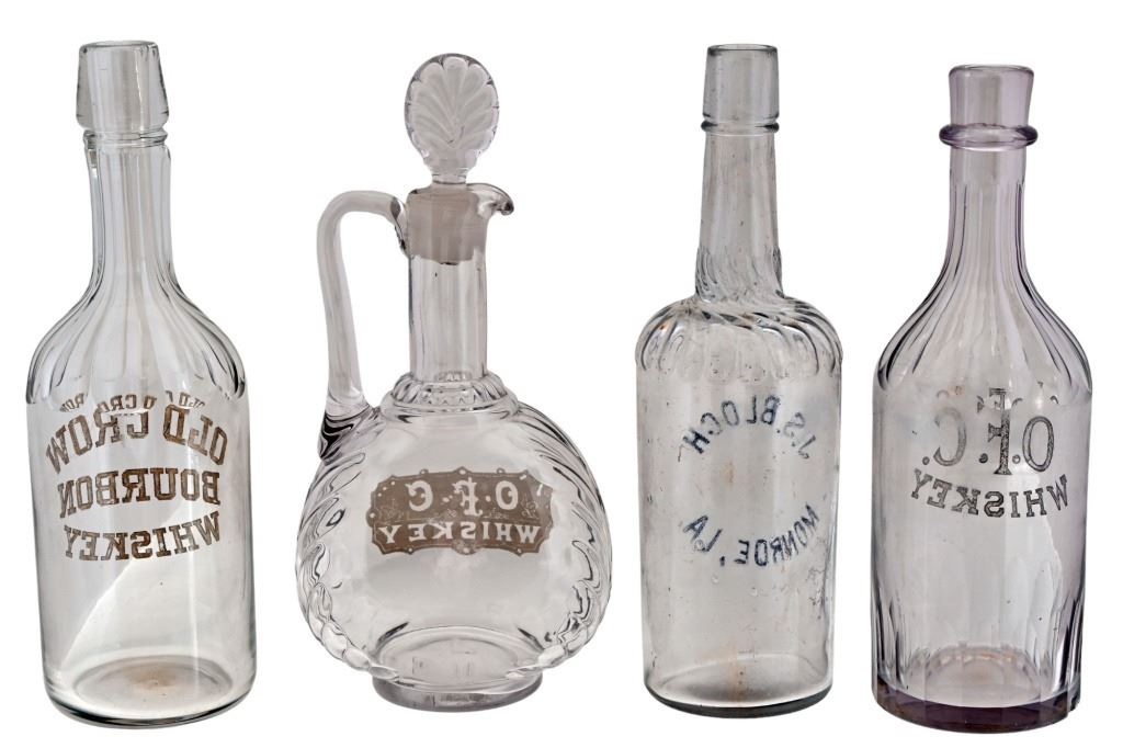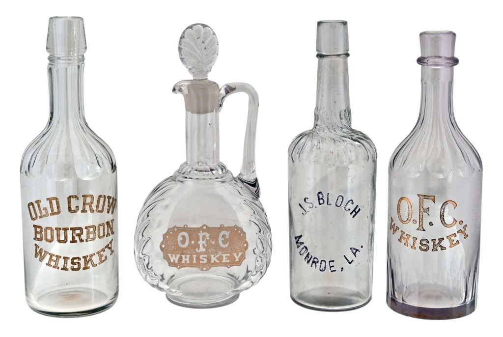 Antique O.F.C Whiskey Decanter with Glass Stopper measures 11" x 5" x 4". One (1) O.F.C. Whiskey Glass Bottle measures 10 1/2" x 3 1/2".. One (1) Old Crow Bourbon Whiskey Glass Bottle measures 11 1/4" x 3 1/2". One (1) J.S. Bloch Monroe Louisiana Glass Whiskey Bottle. By 1908 most states of the Deep South had voted to ban sales of alcoholic beverages, however mail order sales of liquor were still legal. Local businessman James Bloch built the J.S. Bloch building by 1893, located at the corner of Grand and DeSiard Streets. Prohibition eventually shut down his mail-order liquor business, and restaurants housed his building by the 1930's. Bottle measures 3.5" x 10.75"