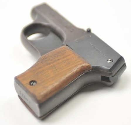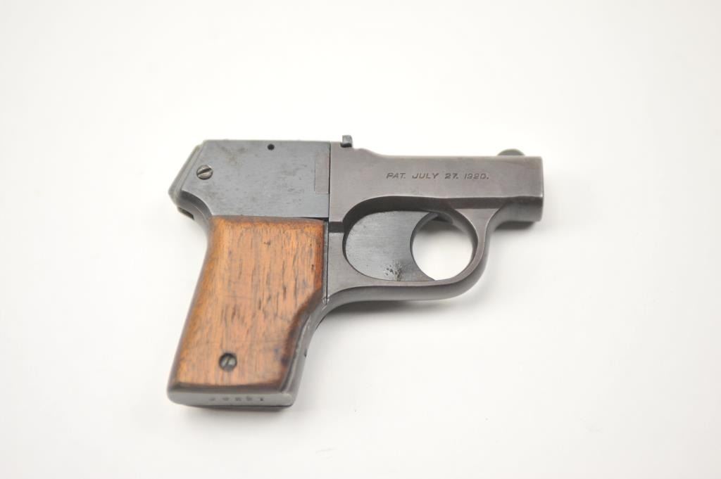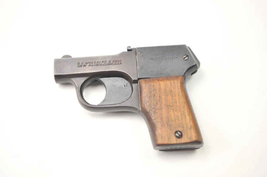 O.F. Mossberg Brownie four shot pepperbox derringer, .22 caliber, Serial #12296. The pistol is in very good overall condition with 2 ½” barrels. The pistol retains significant original finish going to brownpatina with sharp markings. The smooth wood grips are in very good condition. The bores are fair, the action works and the markings are sharp. Est.: $250-500. (C+R/PPT).
