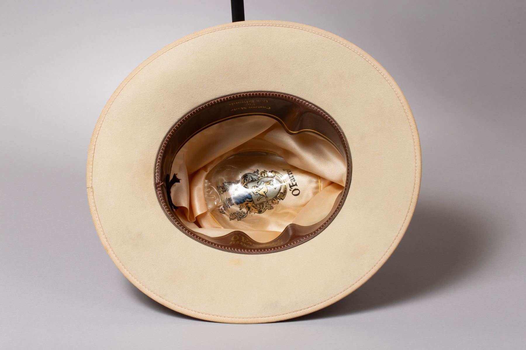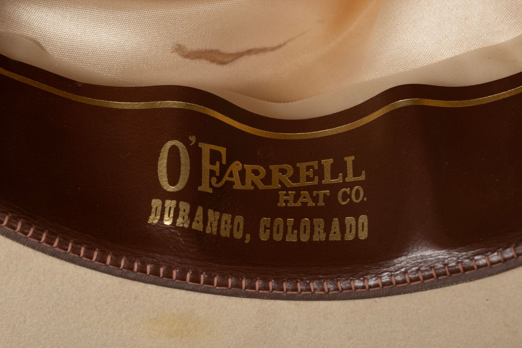 O'Farrell Hat Co. Durango, CO custom made hat for Don Edwards. Marked "O'Farrell Hat CO., DURANGO, COLORADO" and "Custom Made For Don Edwards" on sweatband, lined by fine satin with the O'Farrell crest on inside crown.