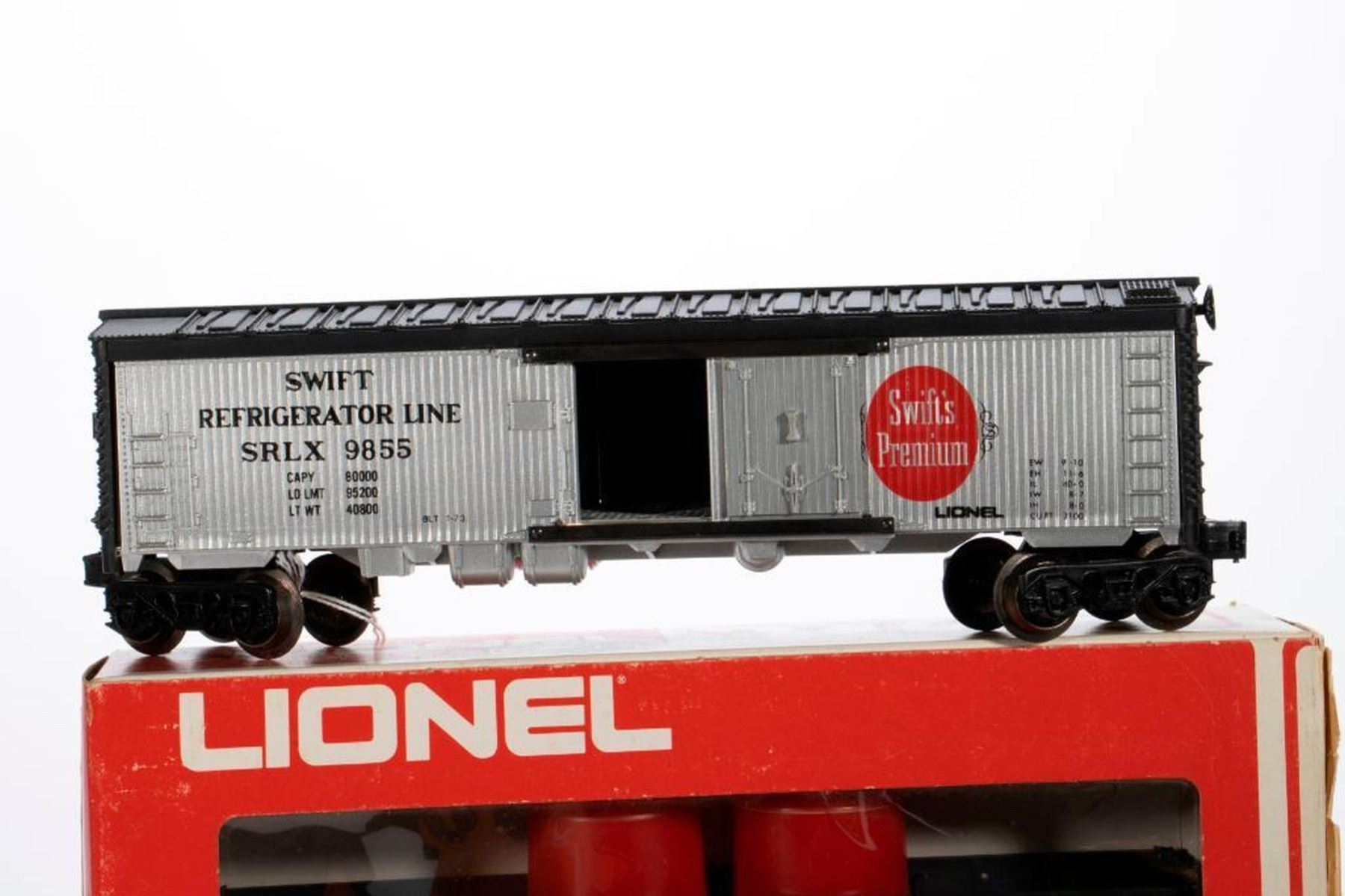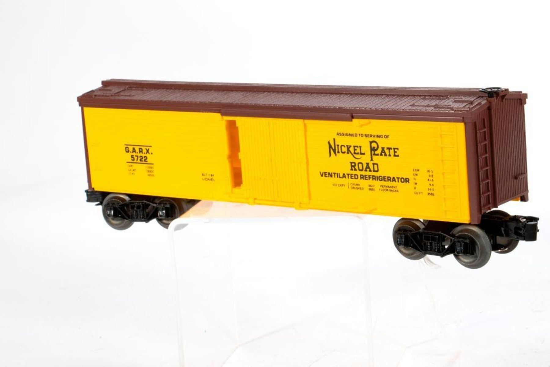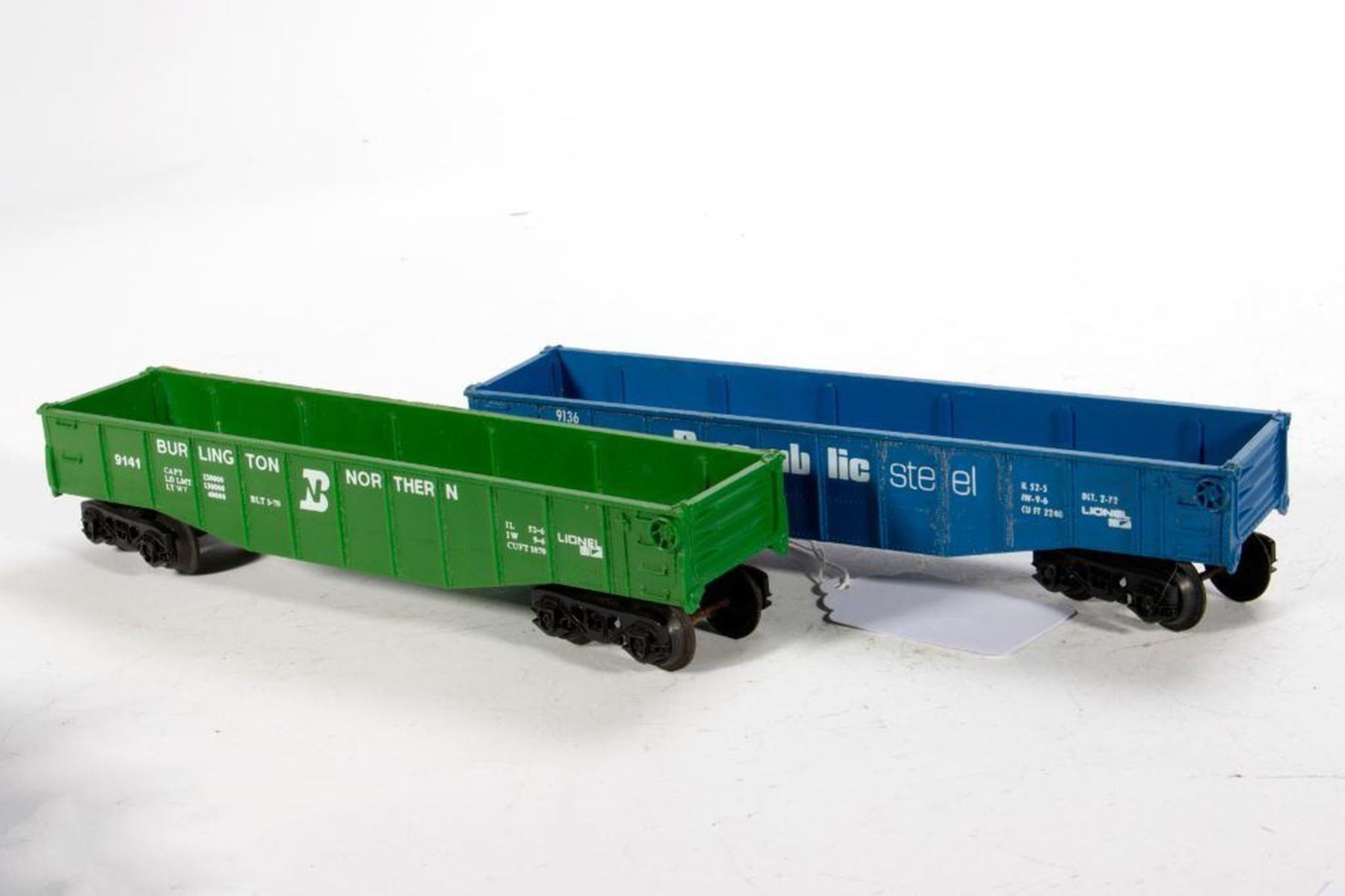 Gondolas: 9822 Grand Trunk with steps, brake wheel and load present,no box; 9144 Rio Grande looks unused with two containers, box with shelf wear; 9136 Republic Steel with rust spots on axles, no box; 9141 Burlington Northern with rust on axles and truck rivets, no box; 16309 Wabash dusty; 9031 NKP dusty; Tank Cars: 2233 Chessie System 3 dome, dusty; 76488 Great Northern 3 dome, dusty; Reefers: 5719 Canadian National with brake wheel and roof walks intact; 5713 Cotton Belt with brake wheel and roof walks intact; 5716 Central Vermont with brake wheel and roof walks intact; 5722 NKP with brake wheel and roof walks intact; 9855 Swift with brake wheel and roof walks intact.