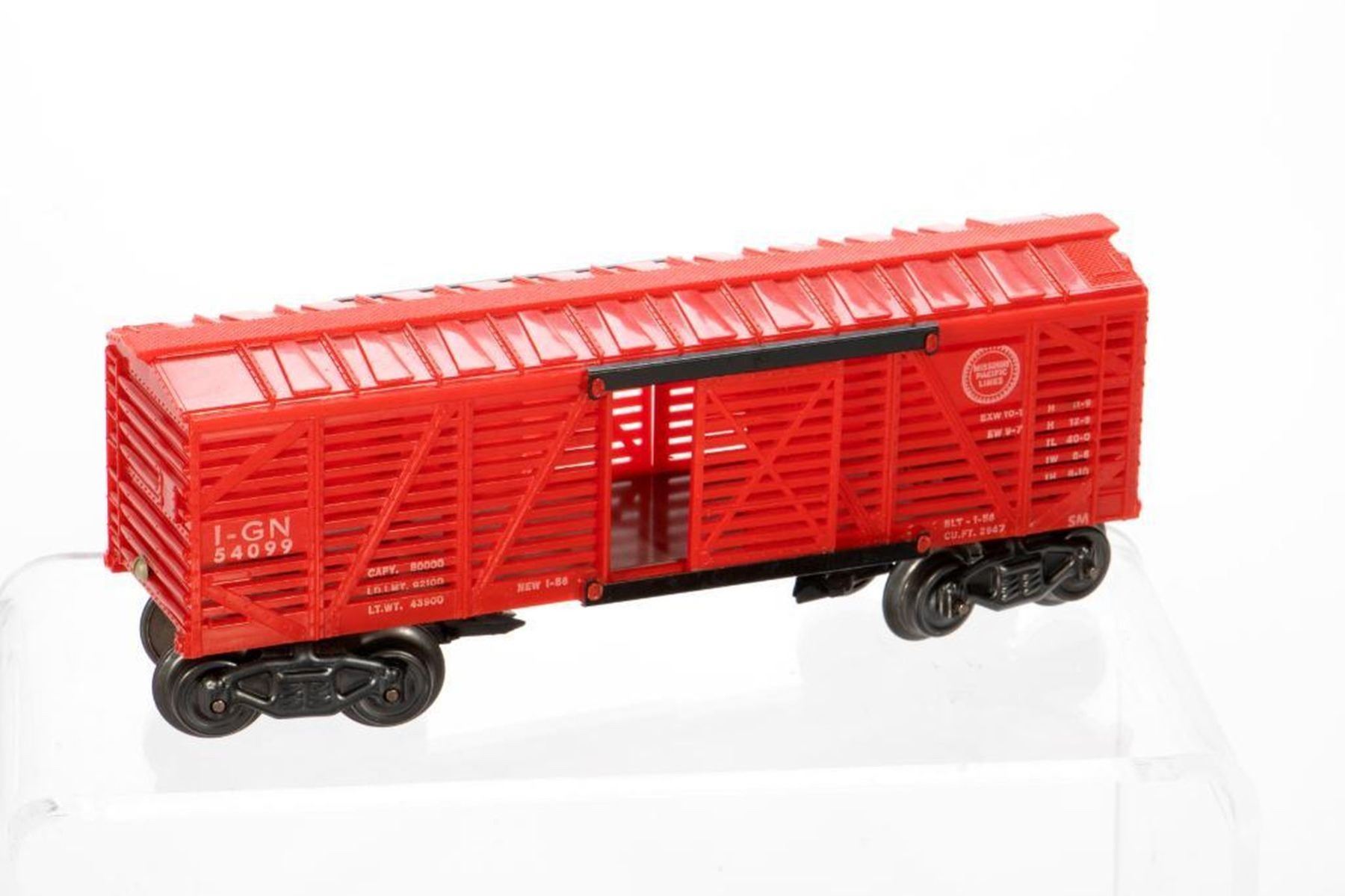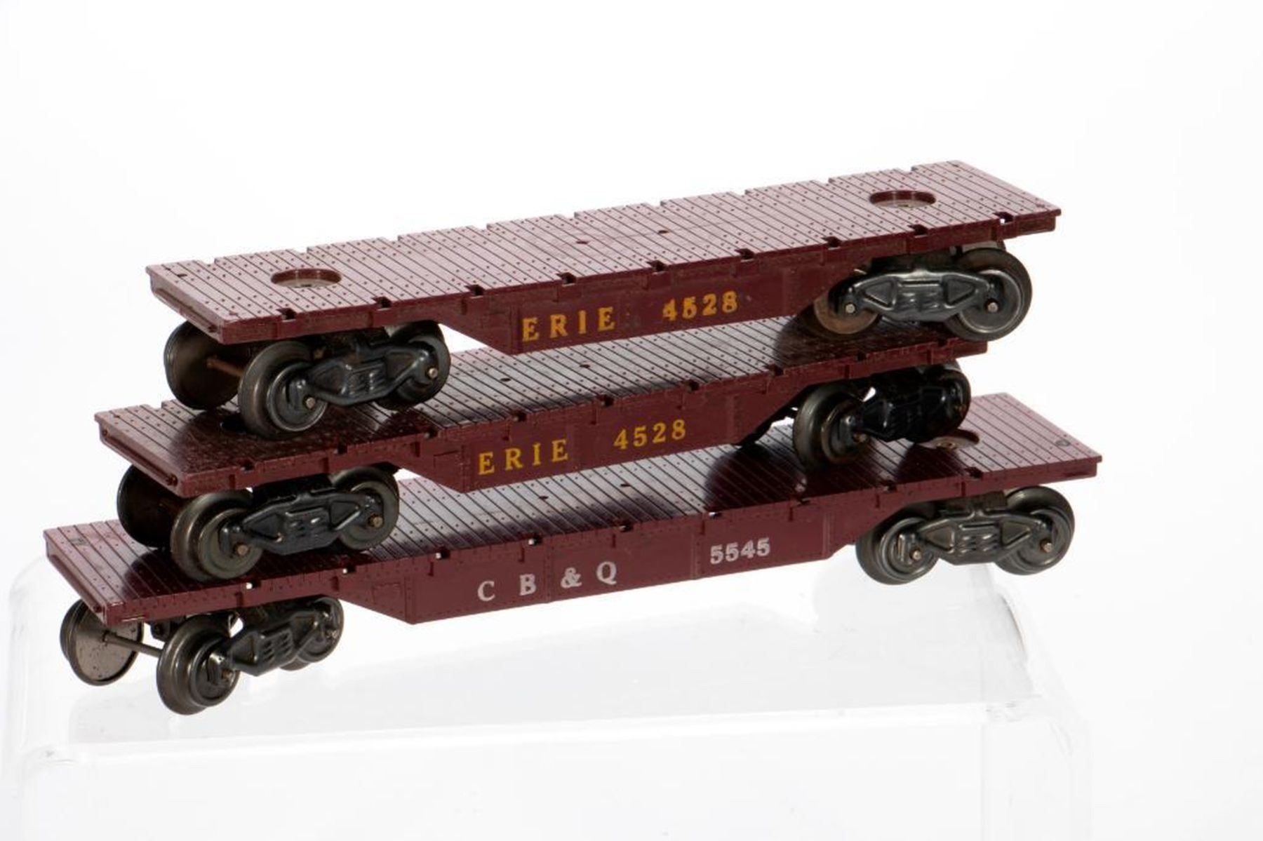 Operating Box Car with no man, (2) Erie medium flat car with no loads, Erie short flat car with no load, CB&Q long flat car with no load, Missouri Pacific Stock Car, B&O Box Car, AT&SF Stock Car, Penn Central Caboose, NYC Caboose, Rock Island Bay Window Caboose, (2) Erie Log Dump car, Erie short flat car with with clip but no load, CB&Q Long Flat with Burlington trailer load with issues