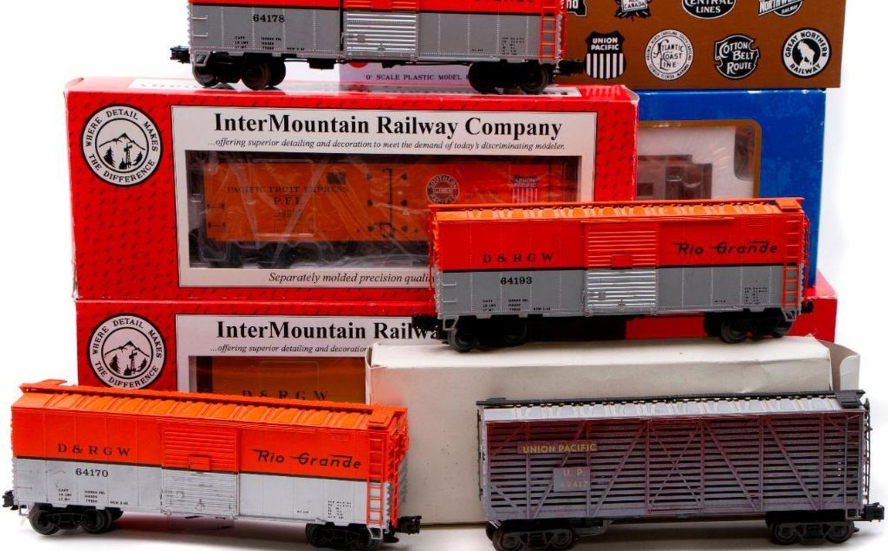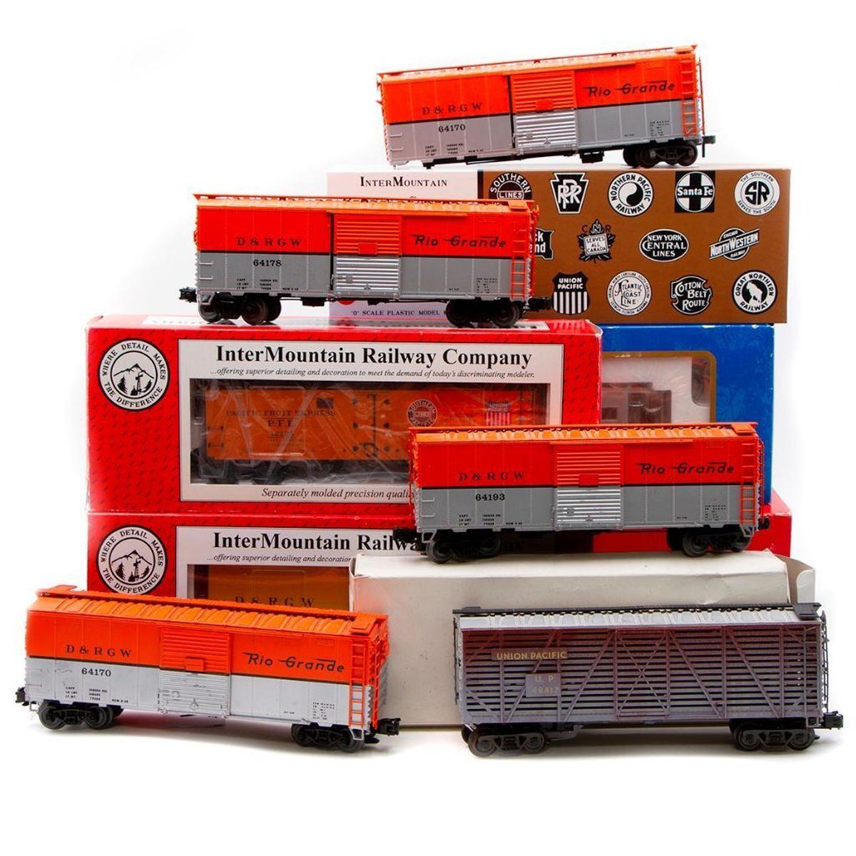 Atlas D&RGW (3) Boxcar (damage to trim) dirty, UP Stock Car (damage to trim) weathered, CB&Q Caboose factory sealed in box. InterMountain Rio Grande Box Car in original box(damage to trim), PFE Reefer in original box (damage to trim) and PFE Reefer Kit in original box (contents not verified but appear to be unused). Red Caboose Western Pacific GP9 in original box with sleeve with hand rail issues but appears to be unused. P&D Hobby Shop special run Atlas D&RGW Single Door Box Car