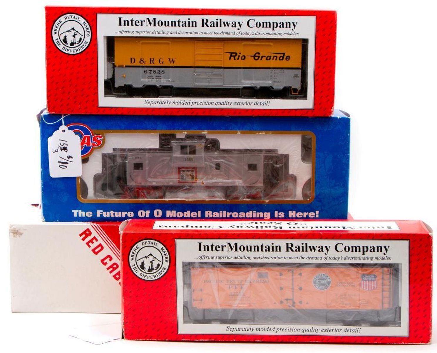 O Gauge (5) Atlas, (3) InterMountain rolling stock and Red Caboose GP9 locomotive