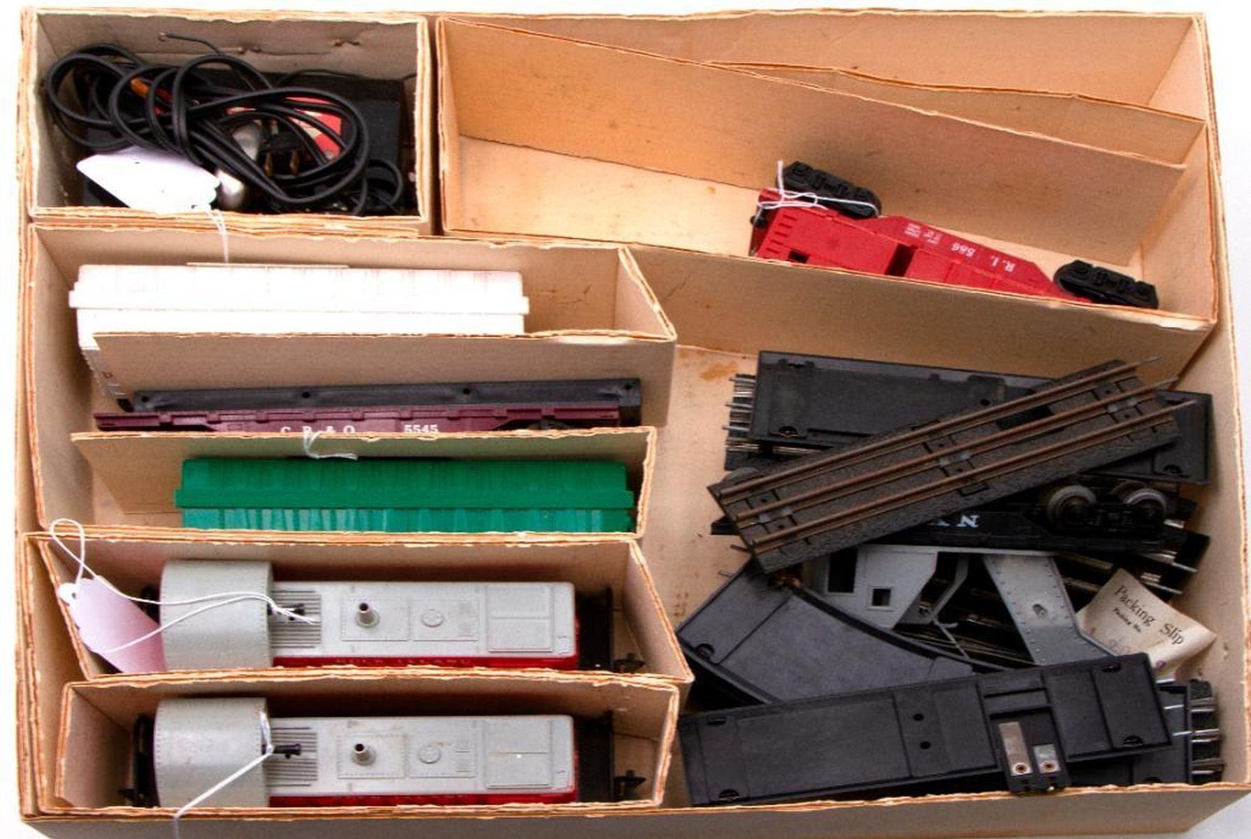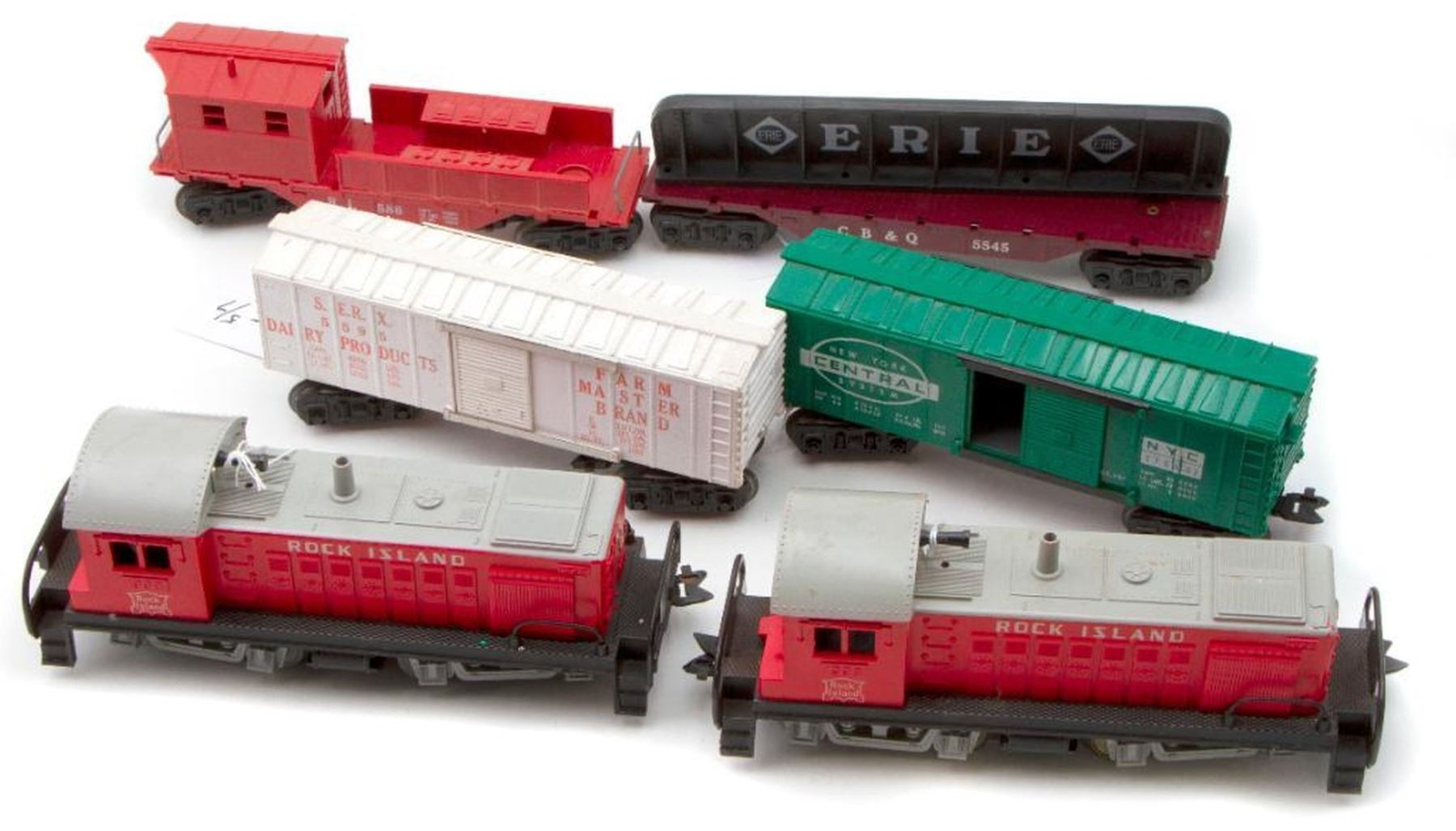Set box with: (2) Marx 1998 Rock Island powered diesel locomotives, Marx NYC 176893 Green Box Car, Marx SERX Dairy Products 5595 Operating White Box Car, Marx CB&Q Long flat car with ERIE girder load, Marx NYC crane car missing knob for hook, Marx Rock Island Work Caboose with broken right rear corner of roof and glue spot on floor, Marx oval of track with black plastic roadbed including (2) uncoupler tracks and (2) terminal tracks/one with track clip, Allstate Marx 100 Watt transformer