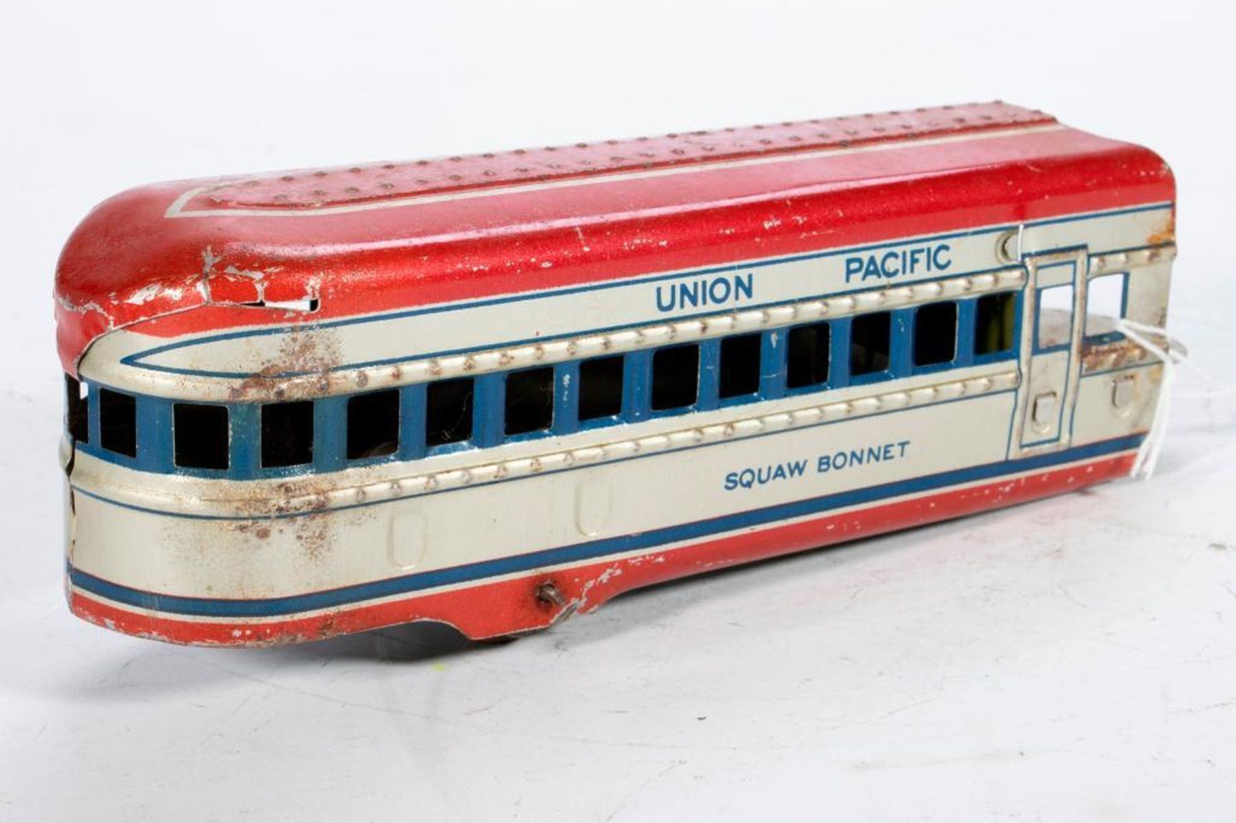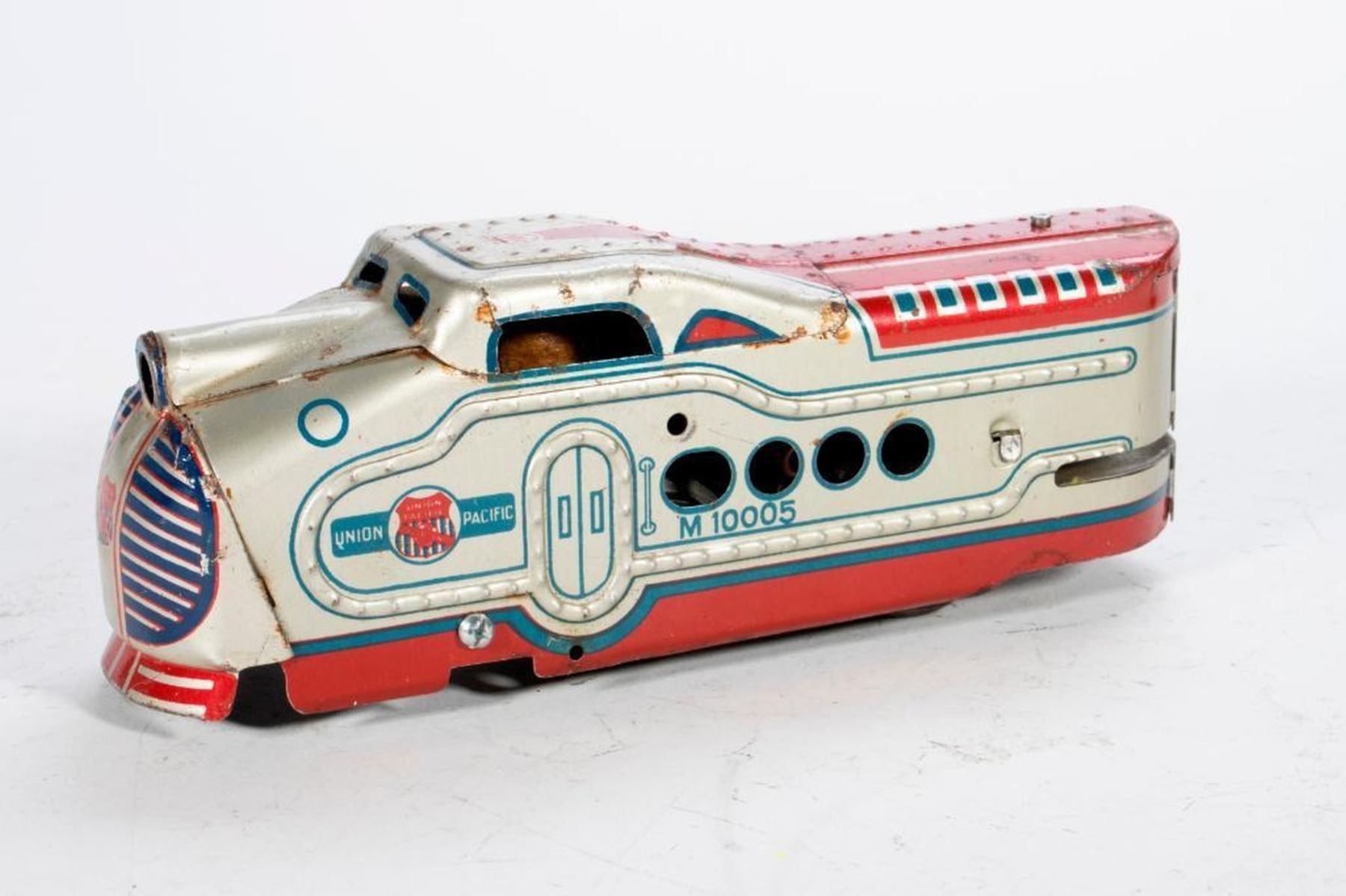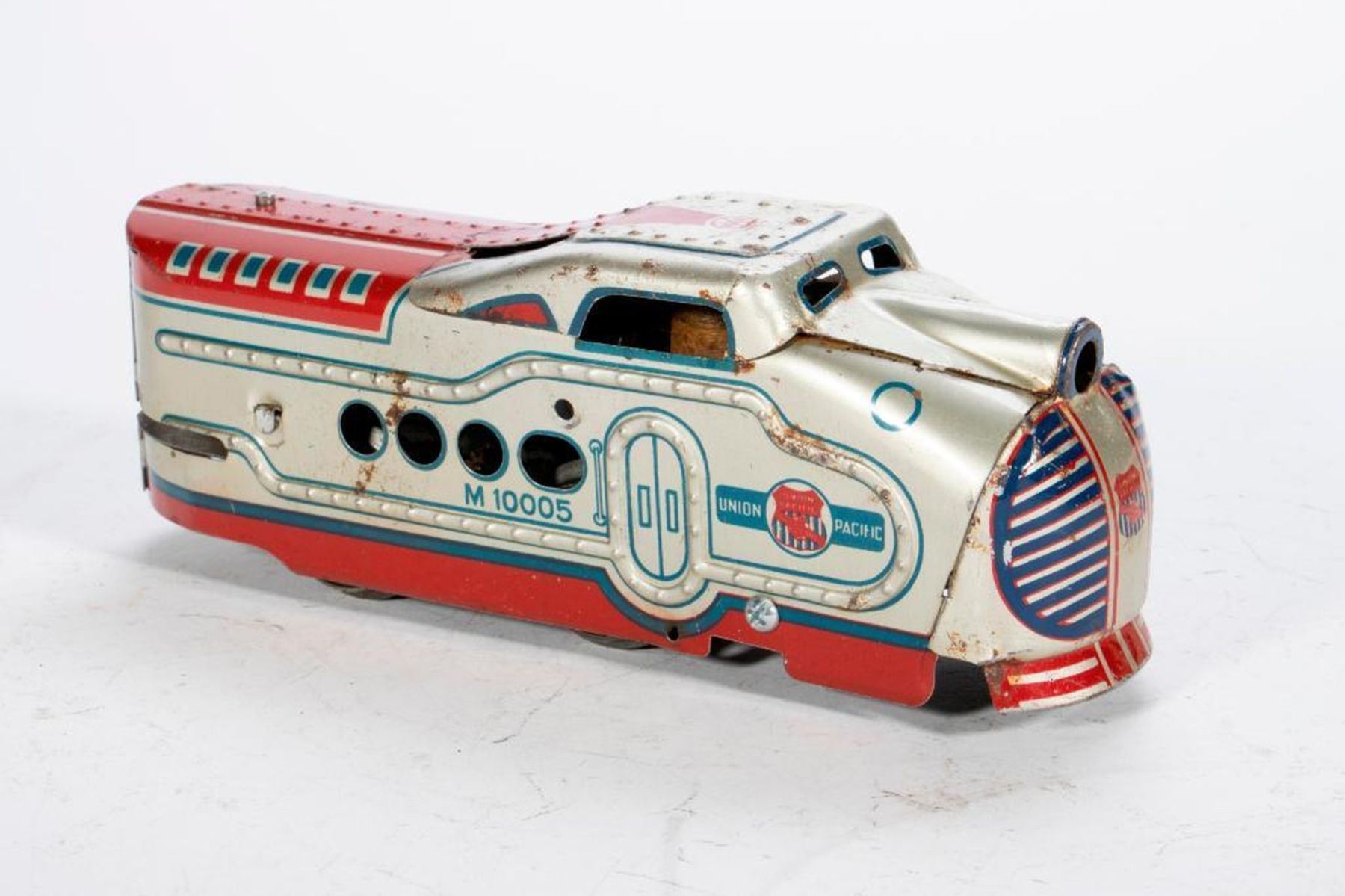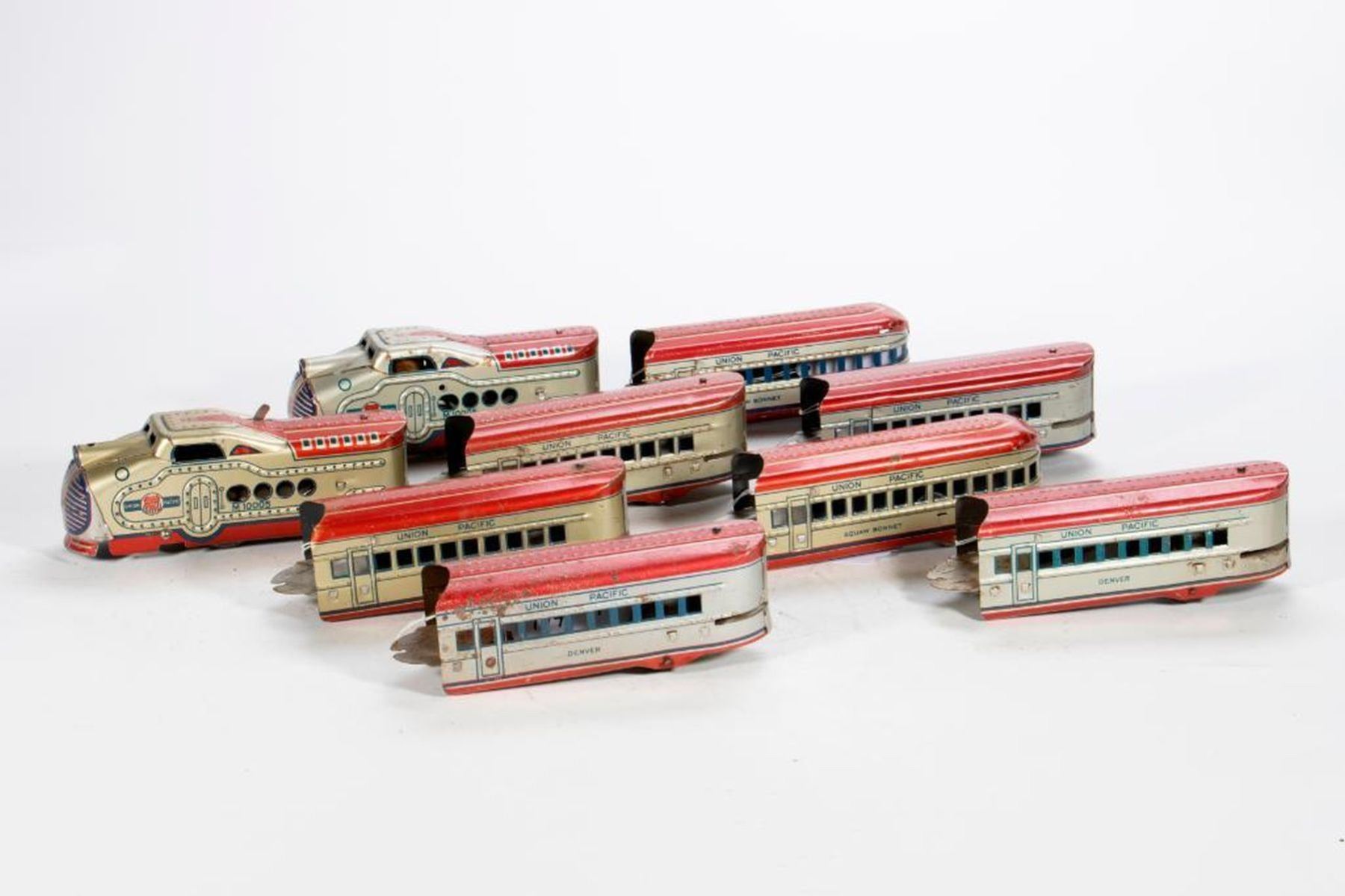 Electric M10005 Locomotive, REA USPS car, Denver Coach, Omaha Coach and Squaw Bonnet Observation all with rust spots and worn lithography some worse than others. Wind up M10005 Locomotive, Denver Coach, Omaha Coach and Squaw Bonnet Observation all with rust spots and worn lithography some worse than others.