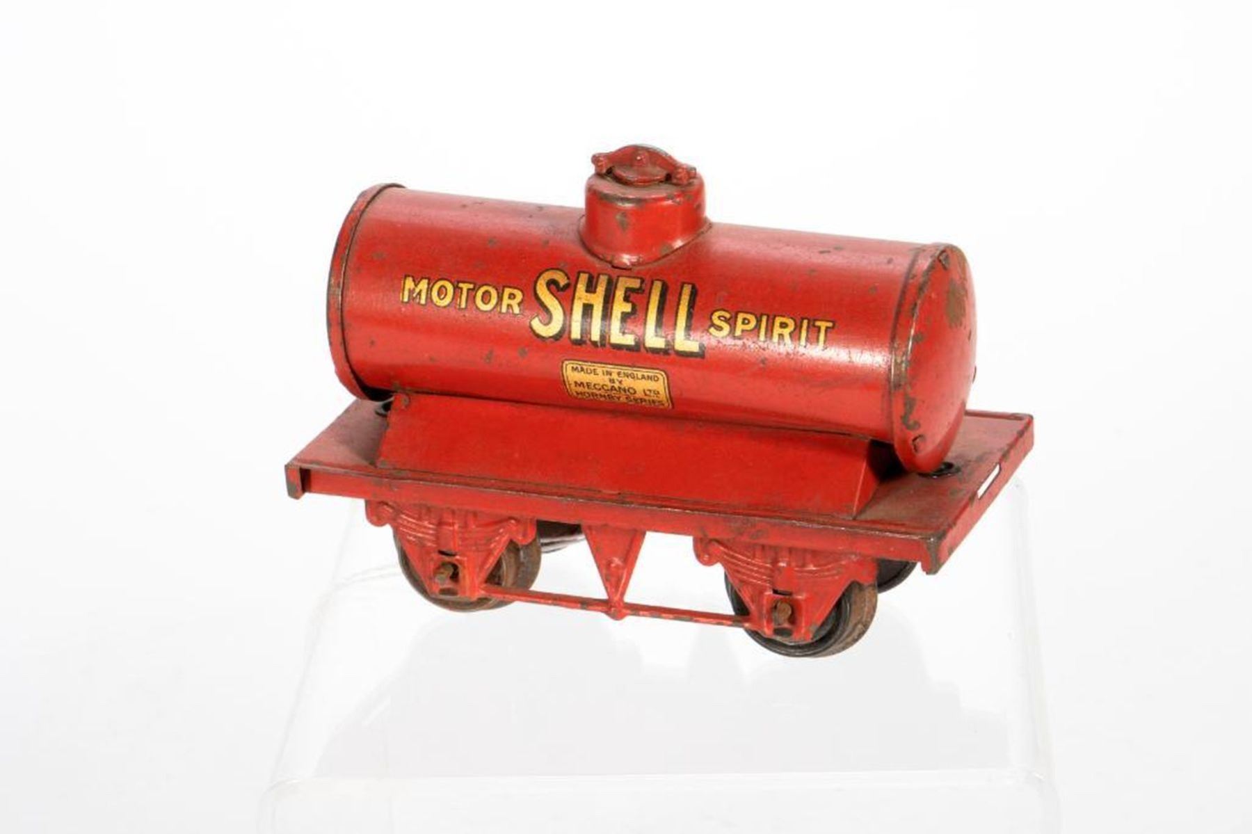 3435 4 Wheel Tender, rust on wheels and couplers (drop link coupler), no holes in frame for buffers; LMS gondola 4 Wheel frame, no wheel sets, rust on drop link couplers and paint chip exposed frame, no holes in frame for buffers; Hornby 4 wheel LNE 12530 gondola - Metal wheels with backs, drop link couplers, rust on couplers, wheels and paint chip exposed frame, no holes in frame for buffers; Hornby 4 wheel LMS goods wagon - chrome metal wheels with backs, drop link couplers, doors with latches, chipped Hornby Series decal, discolored sides, rust on couplers and paint edgeware on frame; Hornby 4 wheel SHELL Motor Spirit Tank Car - missing couplers, rust on wheels, has dome fittings, paint chips; Hornby Crane Car - Has red hook, paint chips