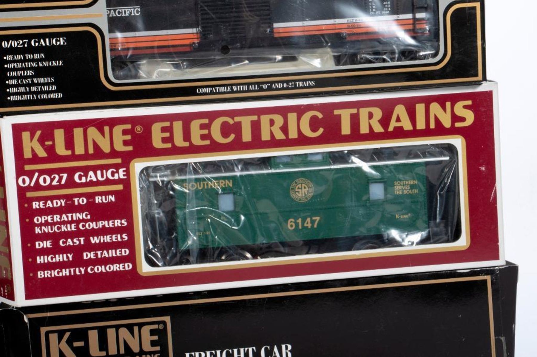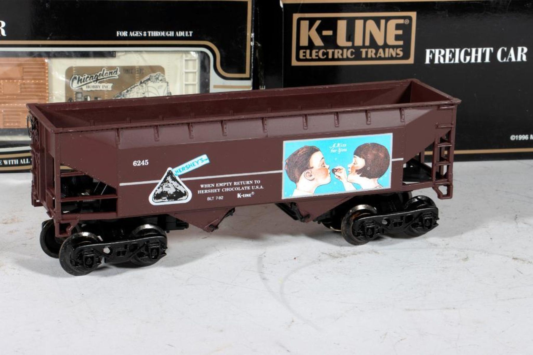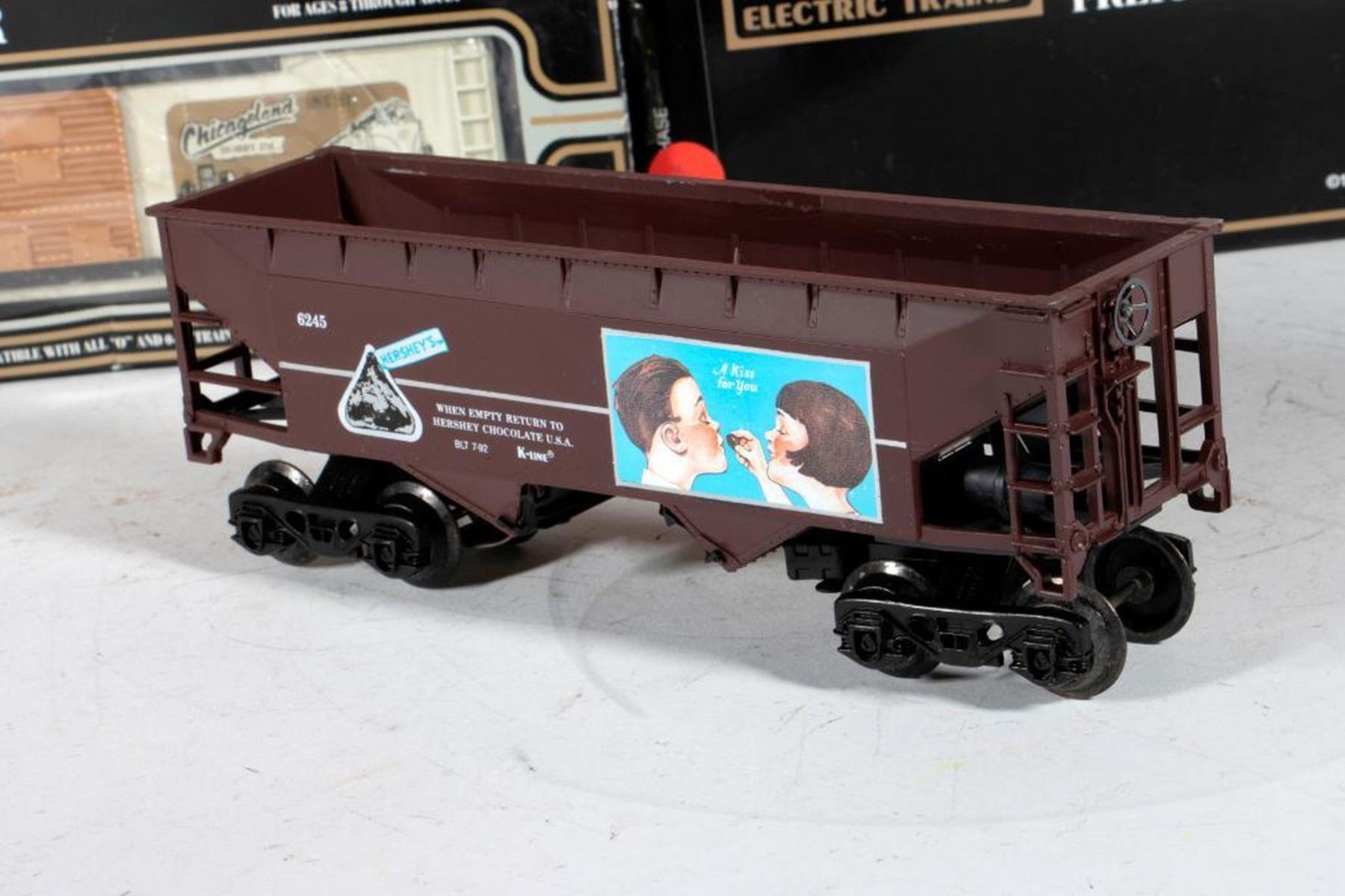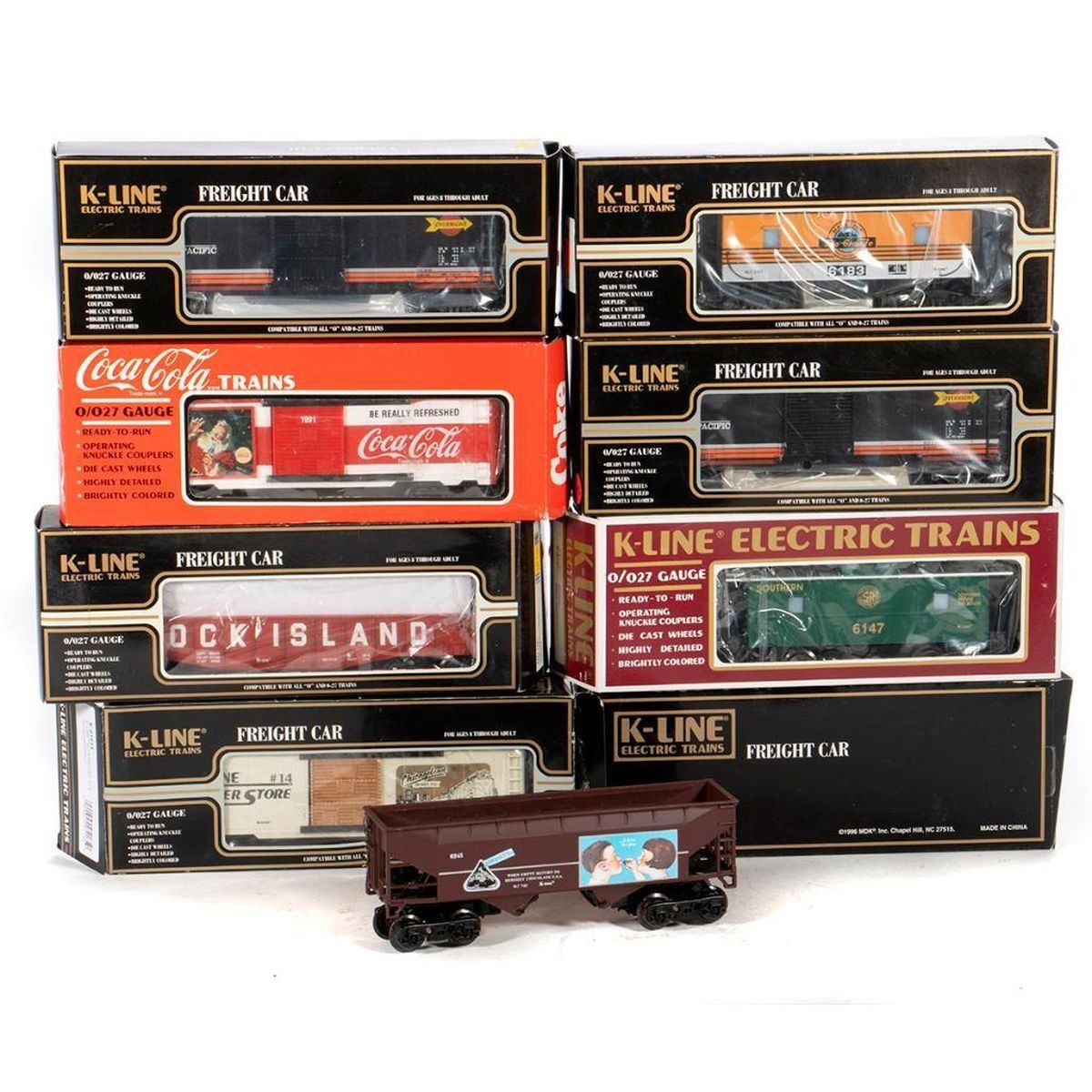 K-6245 Hershey's Kisses Hopper with Box, K-644702 Coca Cola 1991 Christmas Car with box, K-90012 Keokuk Canning Co. Classic Vat Car with box and shipping box, K-6147 Southern Classic Caboose with box, K-6183 Rio Grande Caboose with box, K651-1391 Rock Island Classic Gondola with box, K-644-1491 Rio Grande Double Door Box Car with box, K-91014 Super Store #14 Chicagoland Hobby Box Car with box, K641-90191C TCA Norcal SP Overnight Single Door Box Car with Box, K641-90191C TCA Norcal SP Overnight Single Door Box Car with Box