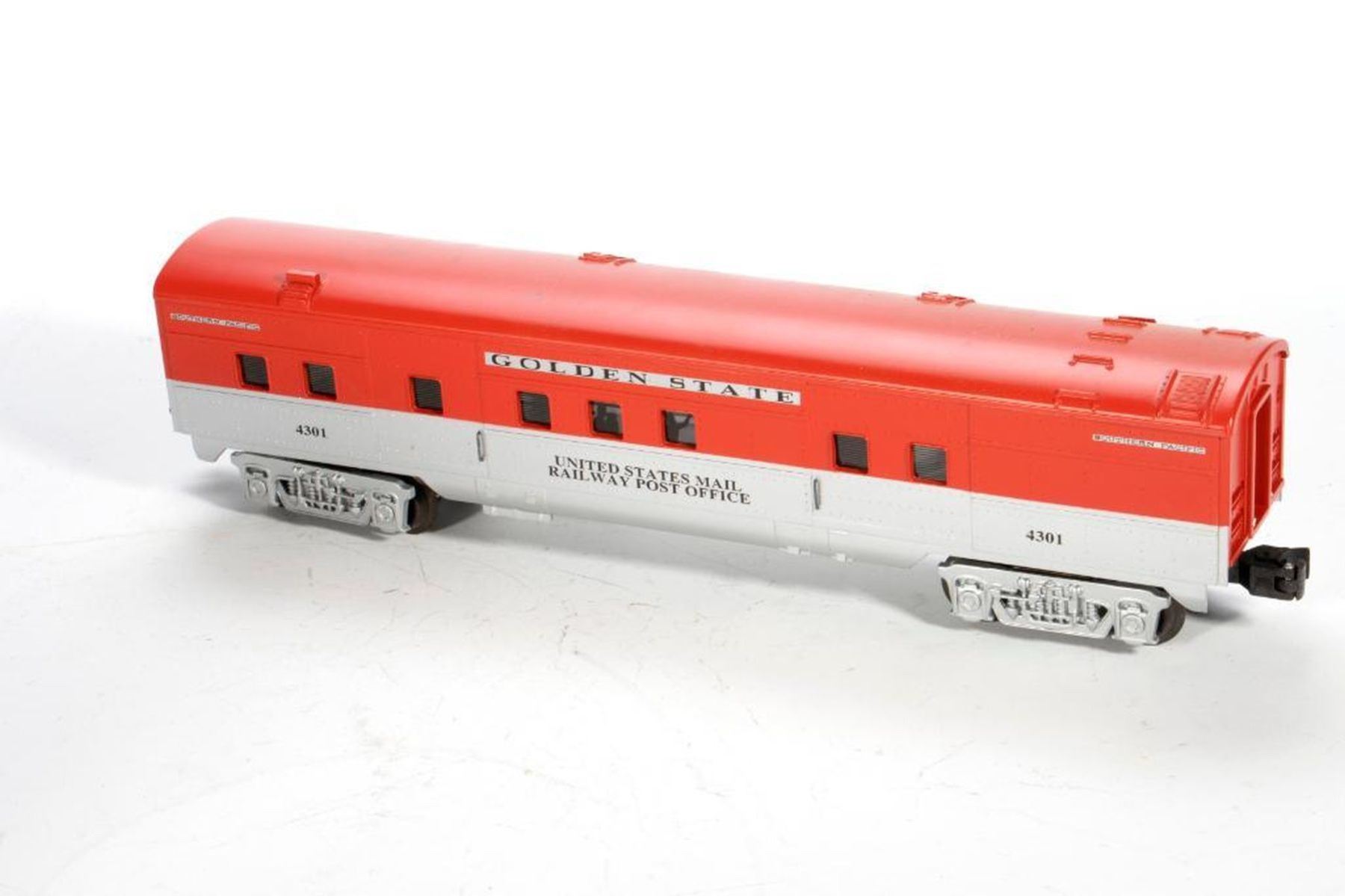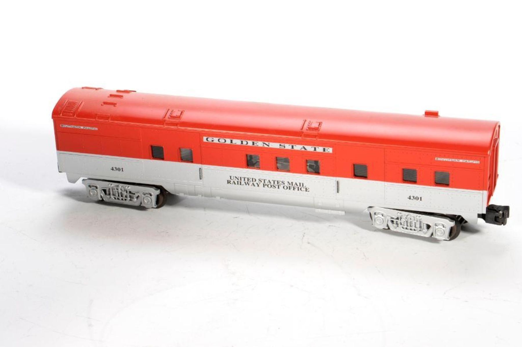 Red silver 0-27 Streamliner. PRR Coach Imperial Range; PRR Coach Imperial Terrace; Rock Island Coach Golden Divan; Rock Island Combine; Rock Island Coach Golden Harvest; Rock Island Coach Golden Lyre; SP Baggage Car; SP Coach Golden Outlook; SP US Post Office Car; SP Coach Golden Moon. All in original packaging with shelf wear.