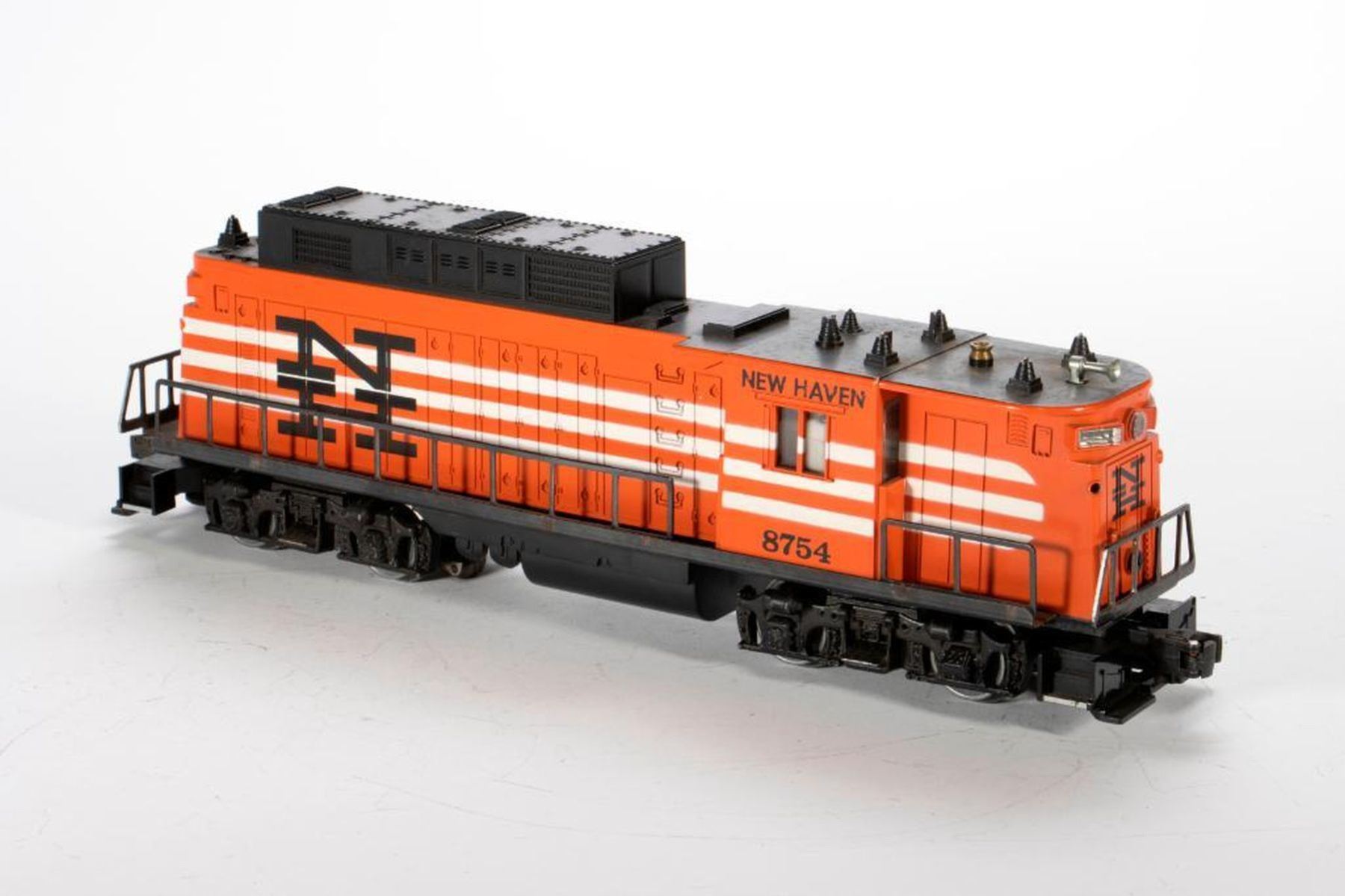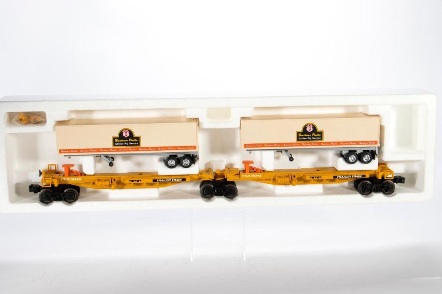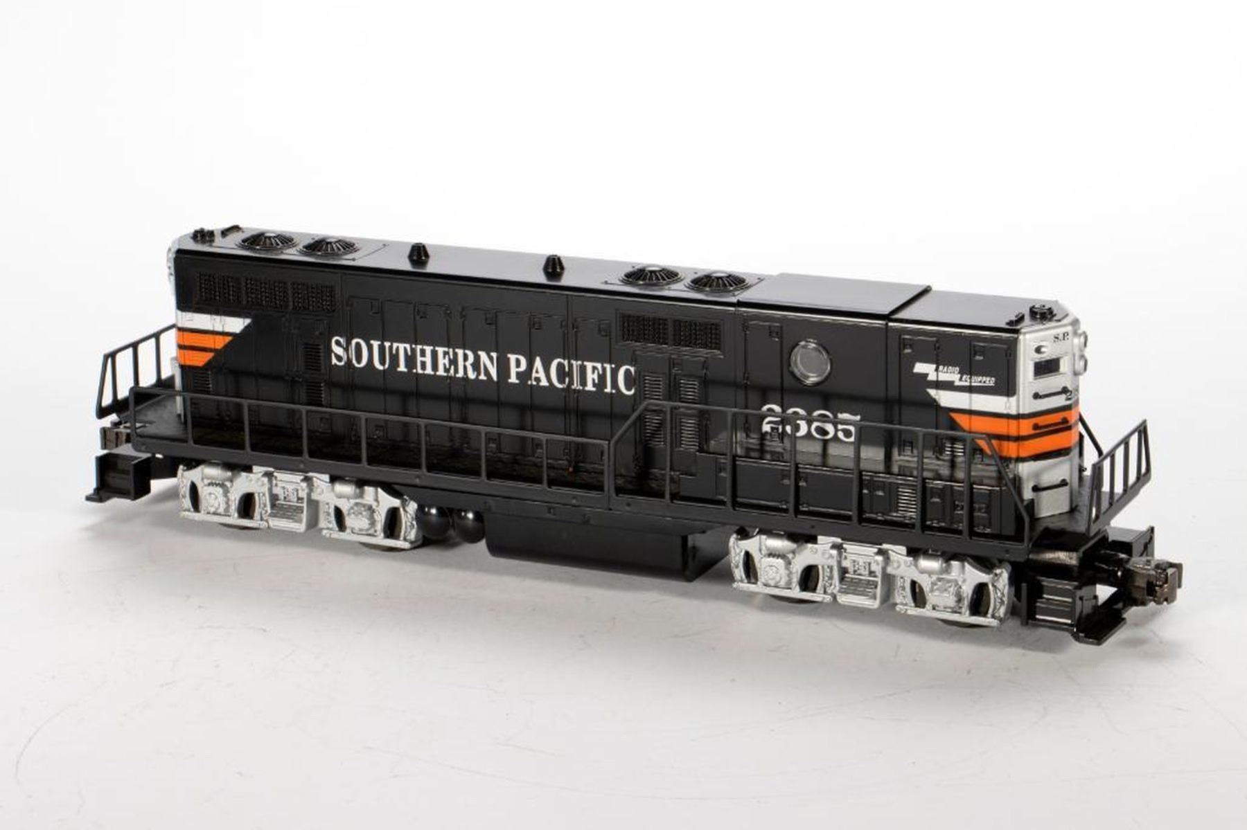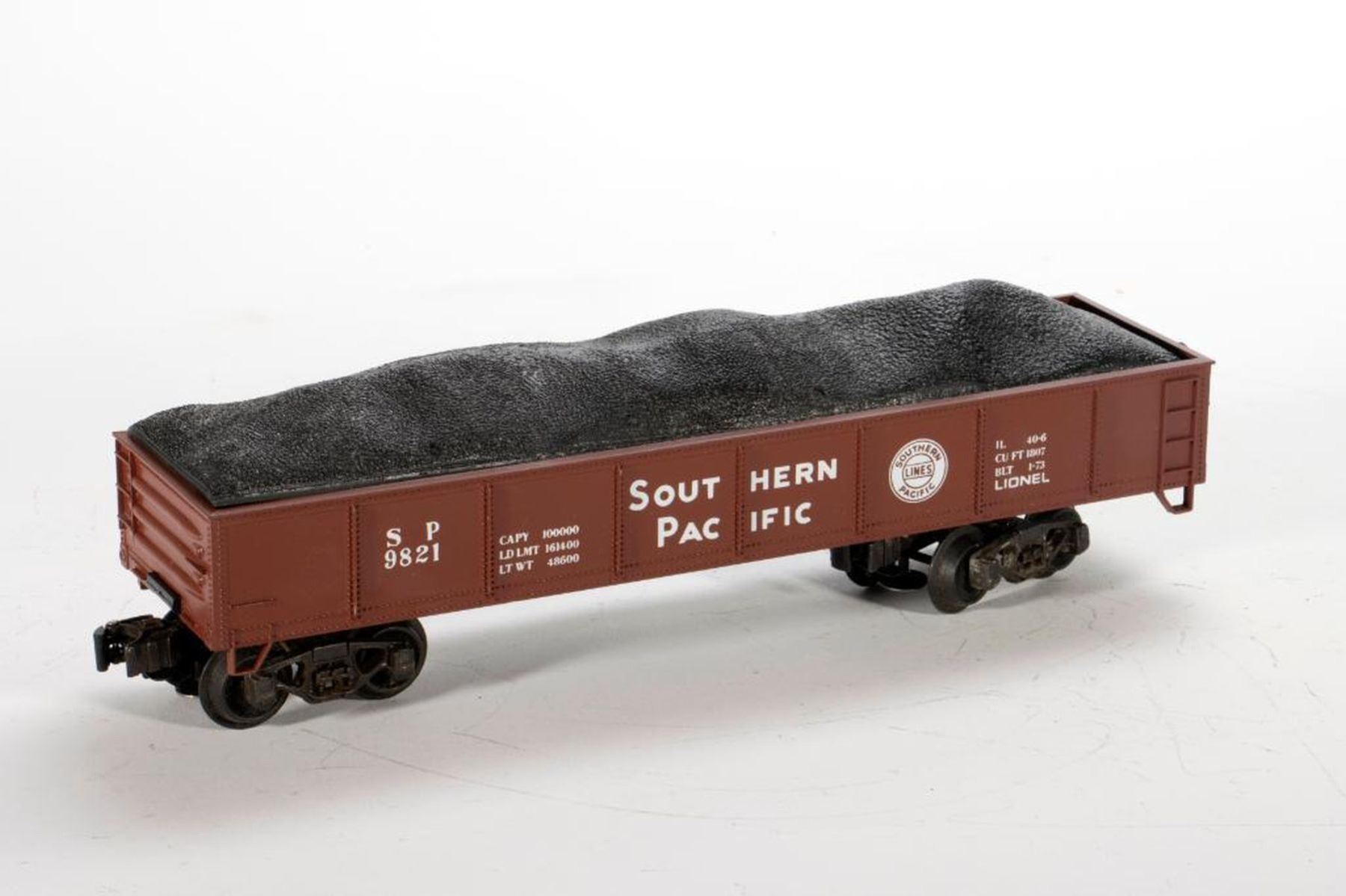 6-18576 Southern Pacific GP9 Dummy (No Cab) in black widow paint scheme - box has shelf wear, torn flaps, styrofoam is worn. Lionel 6-9821 Southern Pacific gondola with load, brakewheel, trucks and couplers intact, box has lots of shelf wear and is missing the window. Lionel 6-16345 Southern Pacific TTUX with Trailers box has shelf wear.