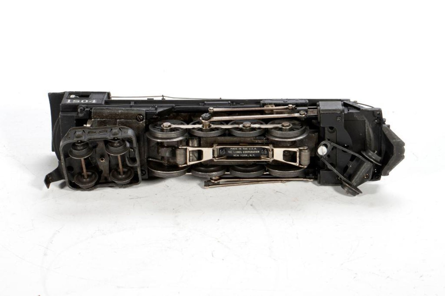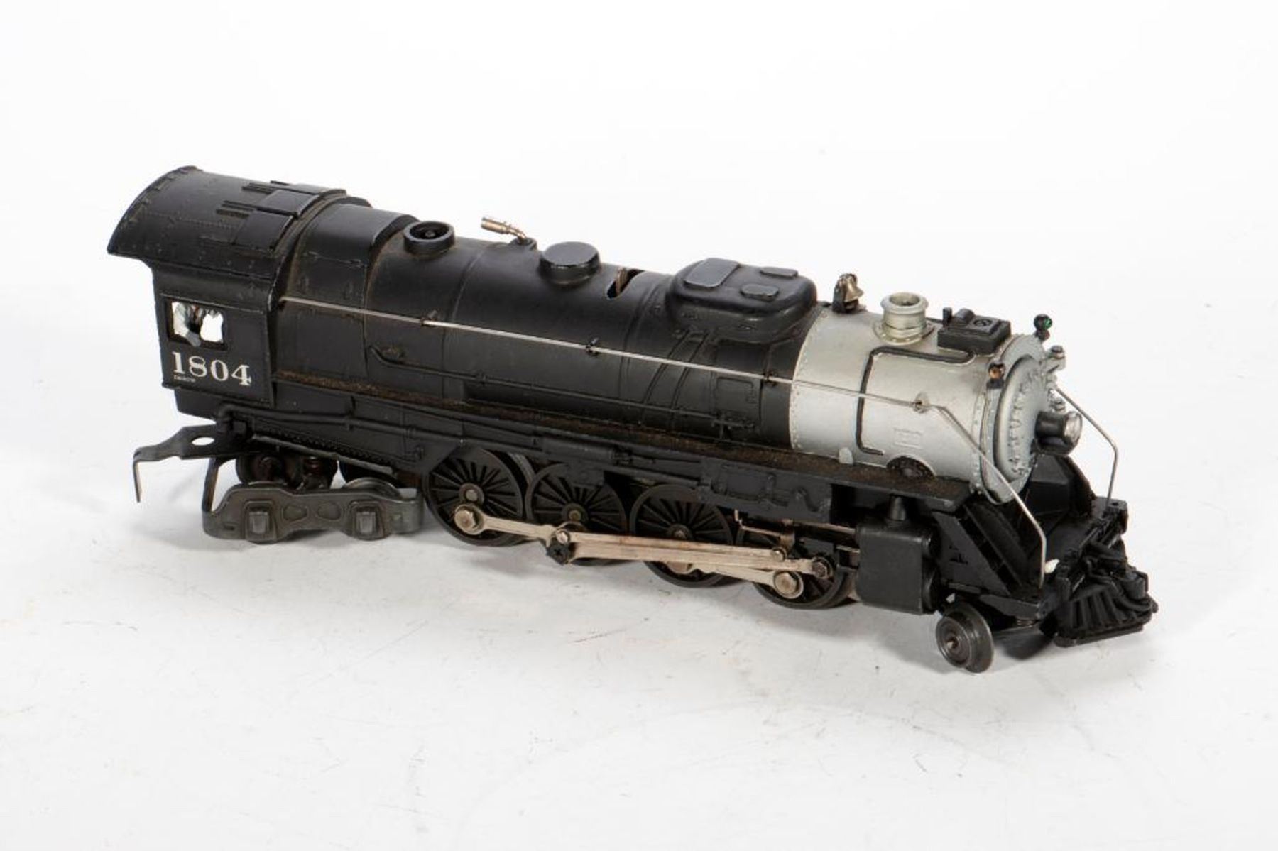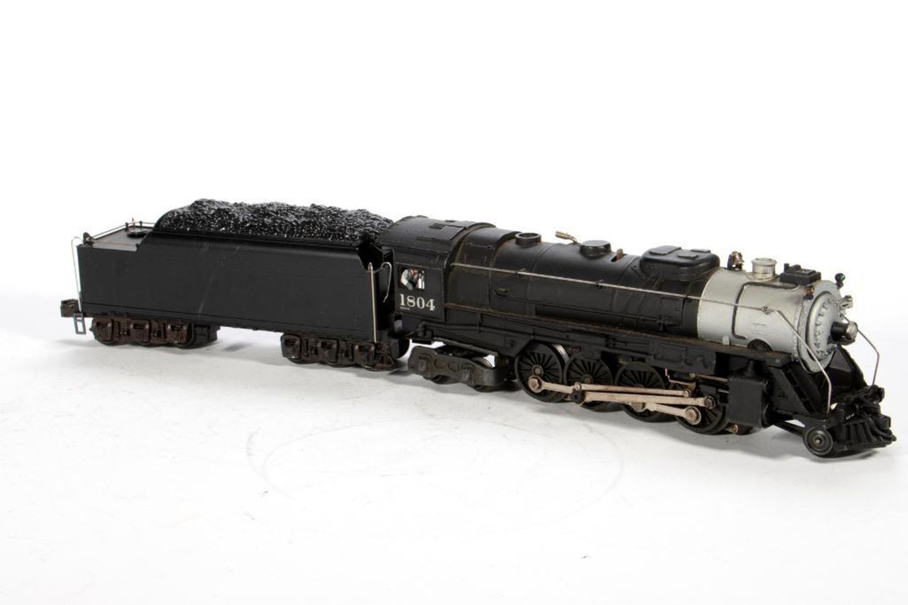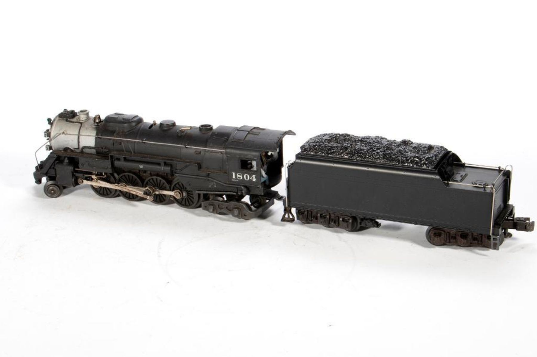 Repainted Lionel Postwar 2-8-4. Now numbered D&RGW 1804. Engineer and Fireman figures added to the cab. Bell, whistle, running gear intact. Railsounds undecorated steam tender with die cast body and six wheel trucks.