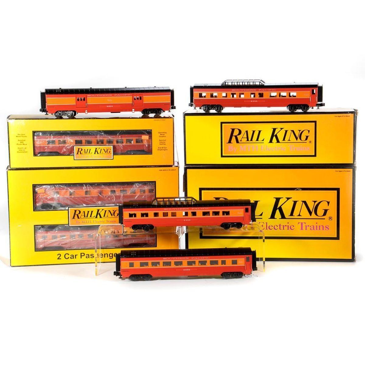MTH Rail King Southern Pacific Daylight 30-2141-1 E-8 A-A, 30-2141-3 E-8 B unit, 30-6727 Coach, 30-6725 two car set sleeper and diner, Vista Dome no box, Coach no box, Vista Dome no box, Baggage Car no box. Boxes have shelf wear