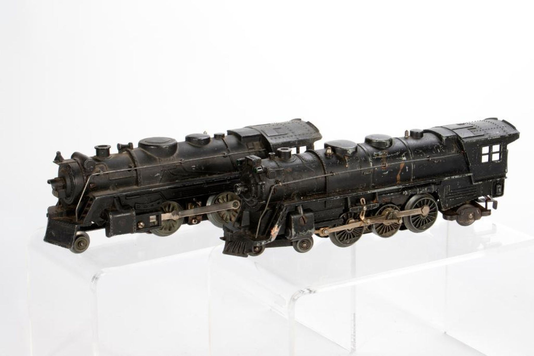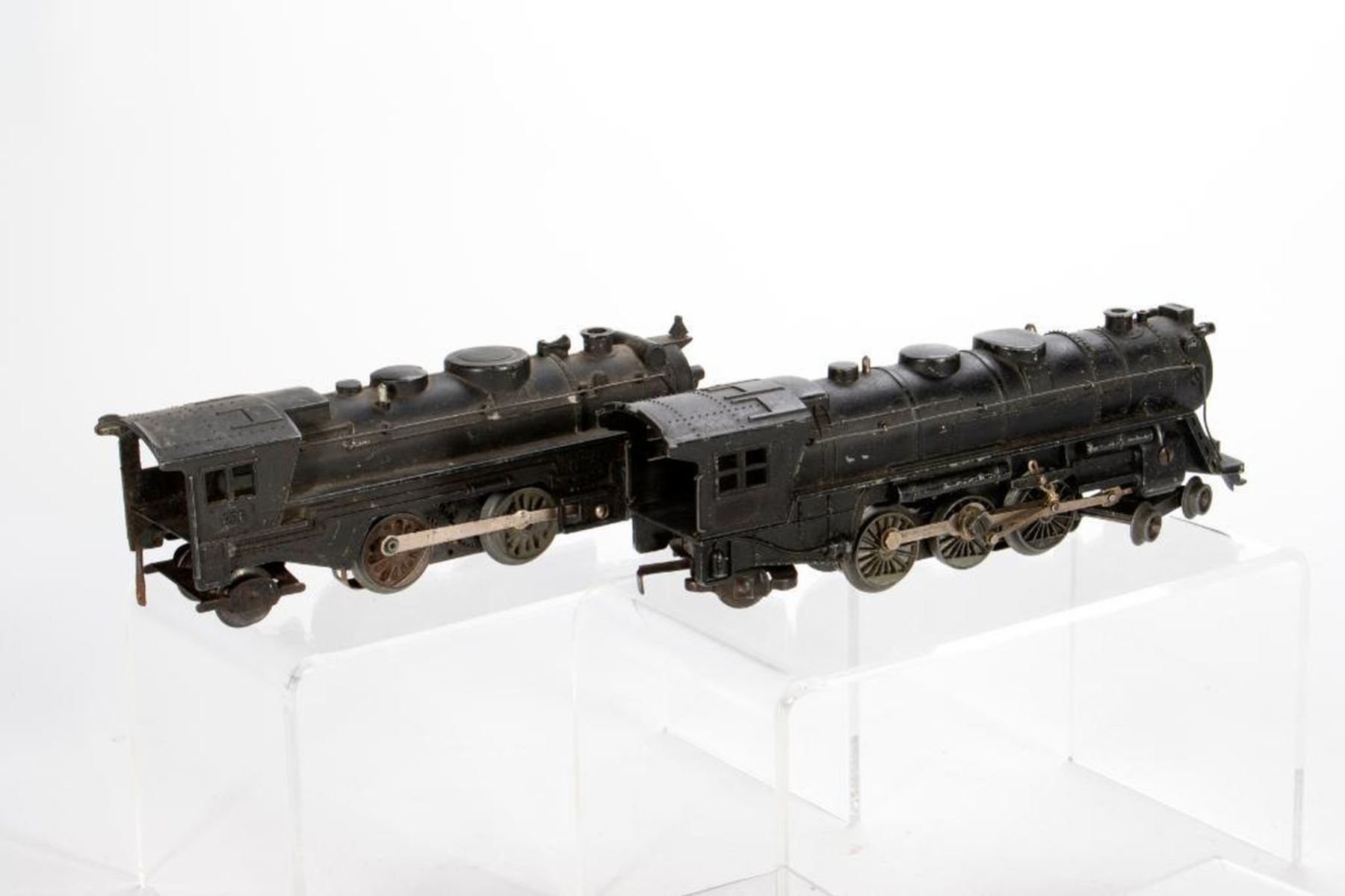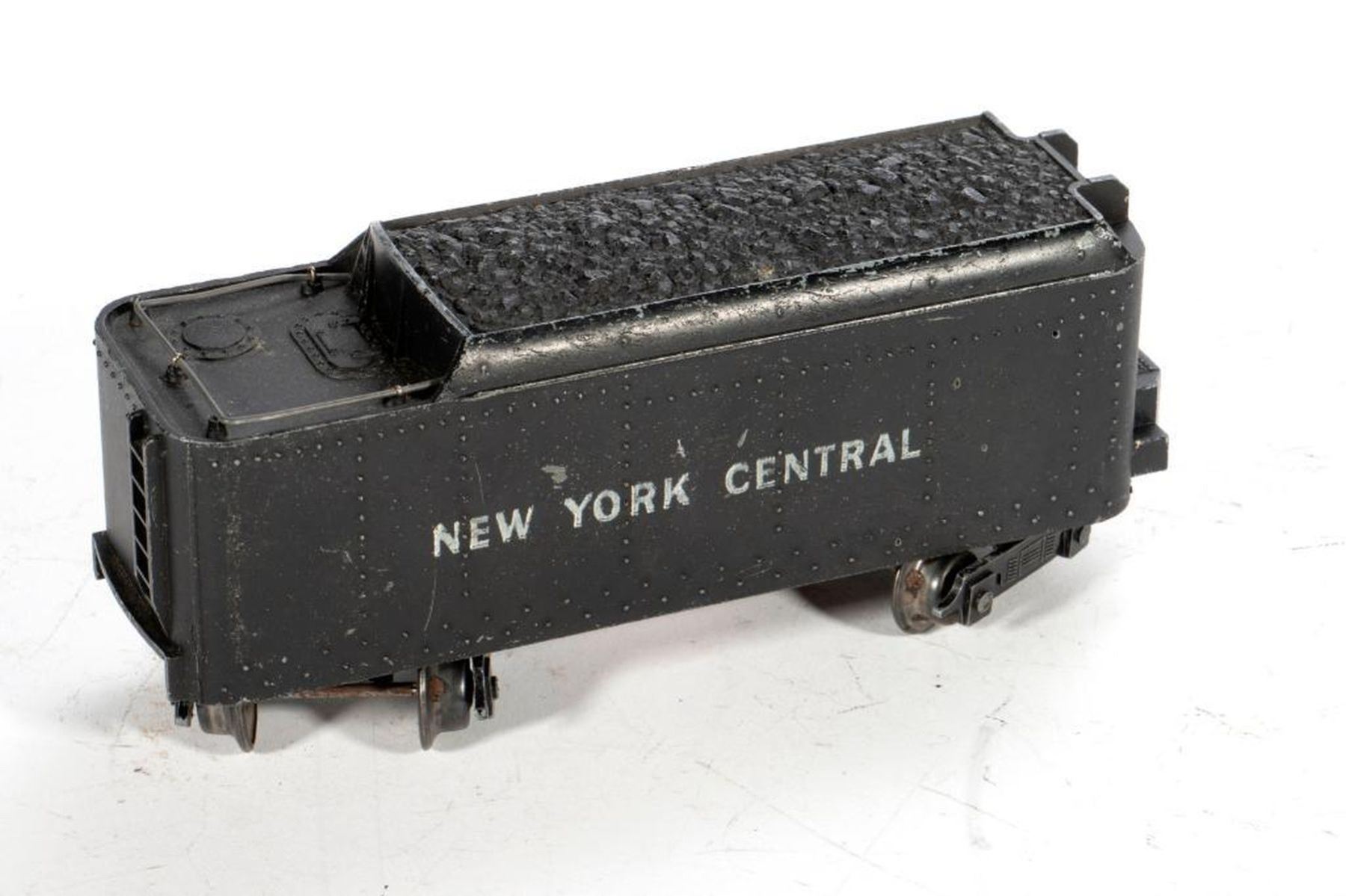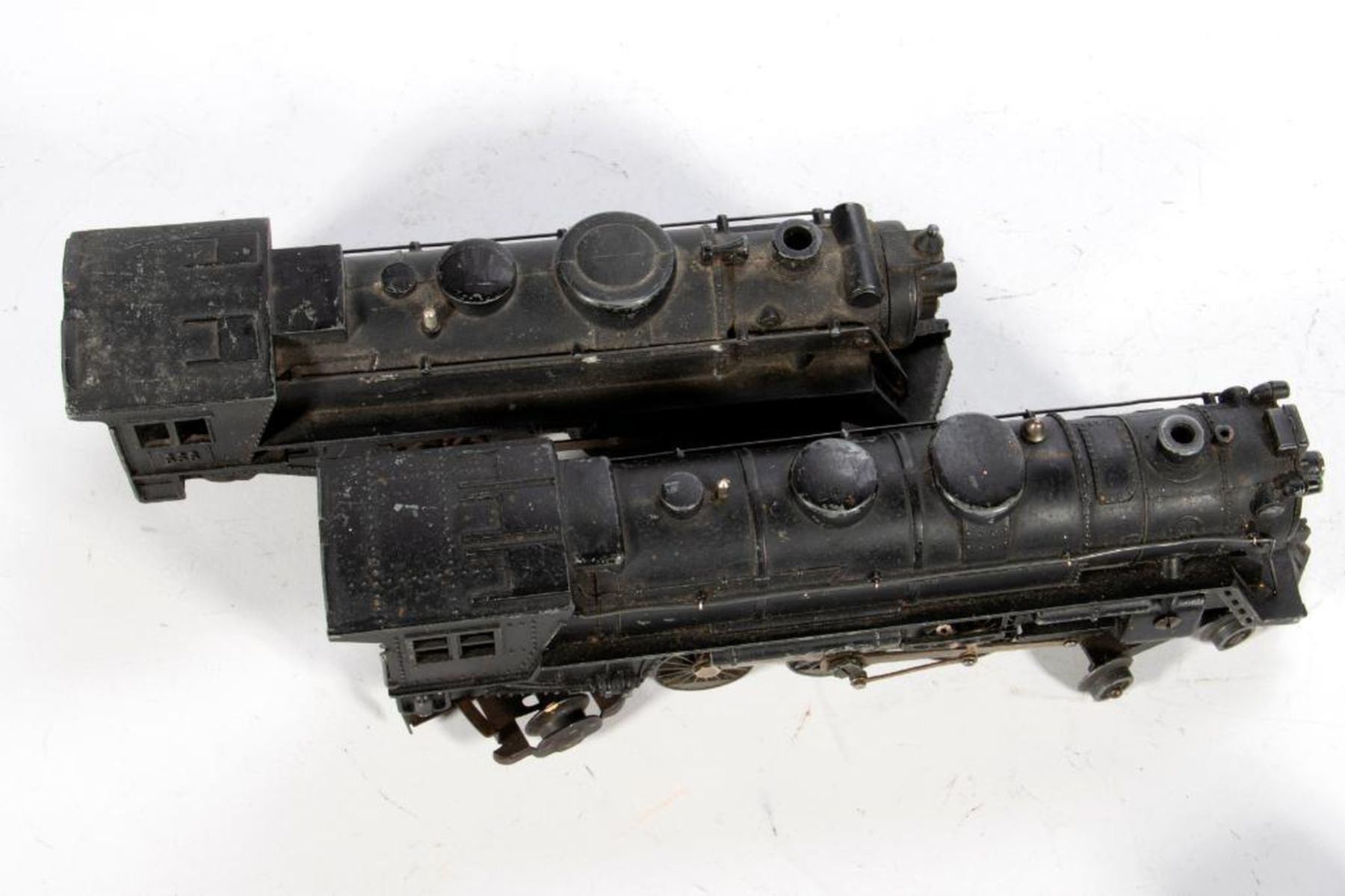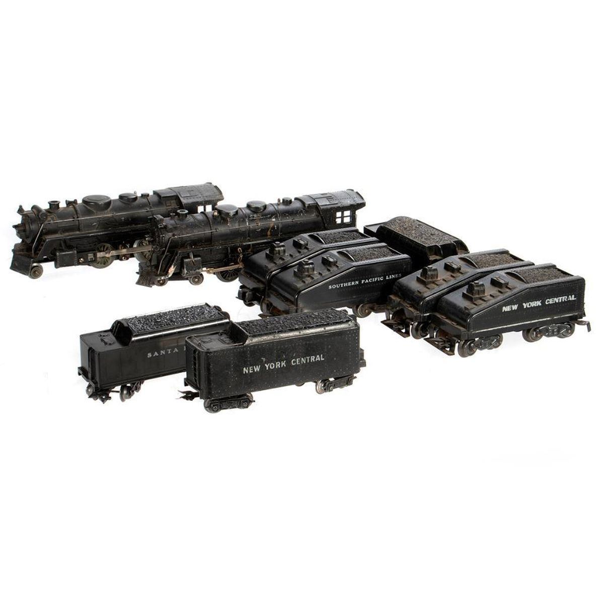 Marx 333 Die Cast 4-6-2 locomotive with Die Cast 8 wheel New York Central tender. 666 Die Cast 2-4-2 locomotive with plastic 8 wheel Santa Fe Tender, (2) NYC Slope Back Tender, Southern Pacific Lines slope back tender, Allstate Slope Back Tender, Santa Fe 8 wheel tender, remains of NYC wedge tender (sides and frame, no top, no wheels, no axles all rusty)