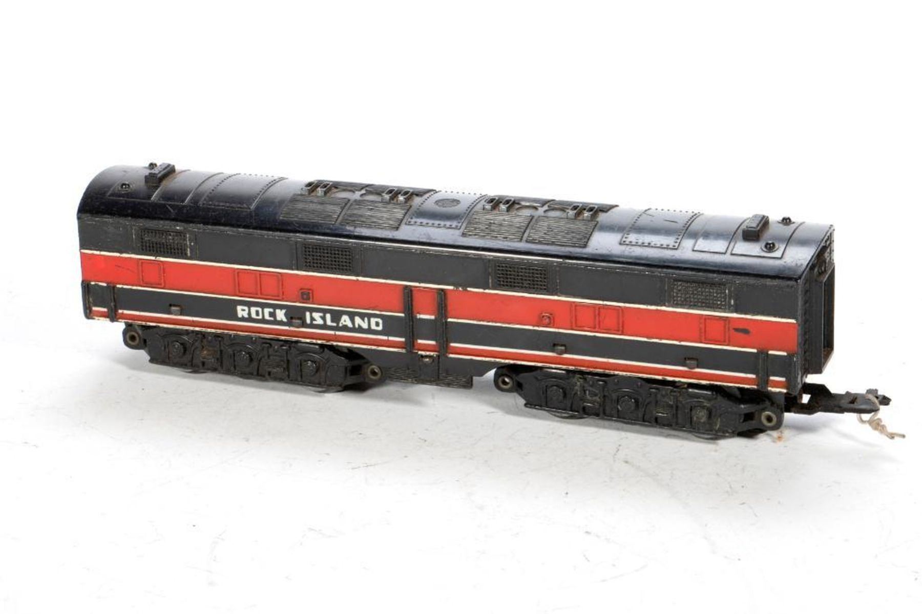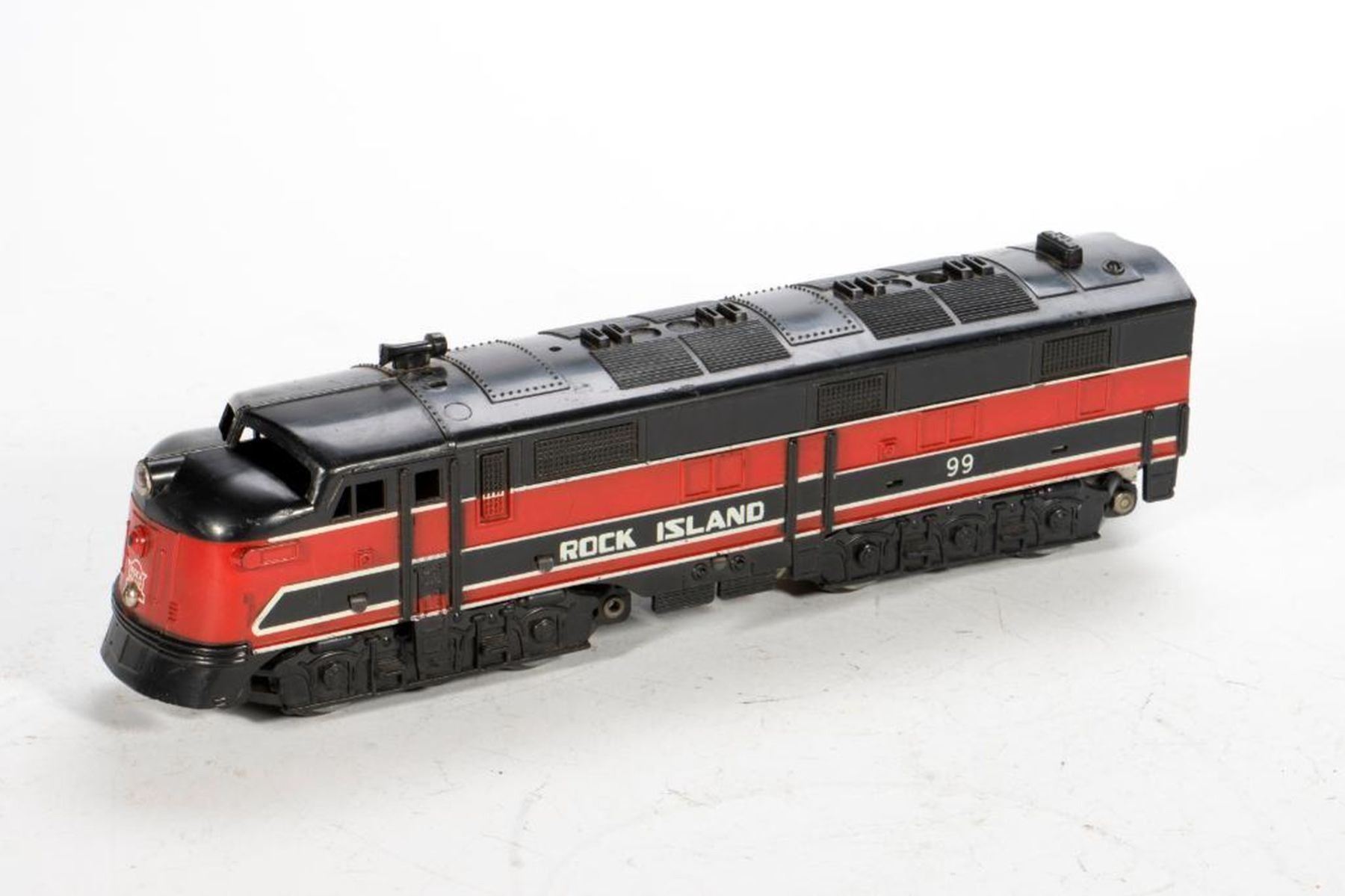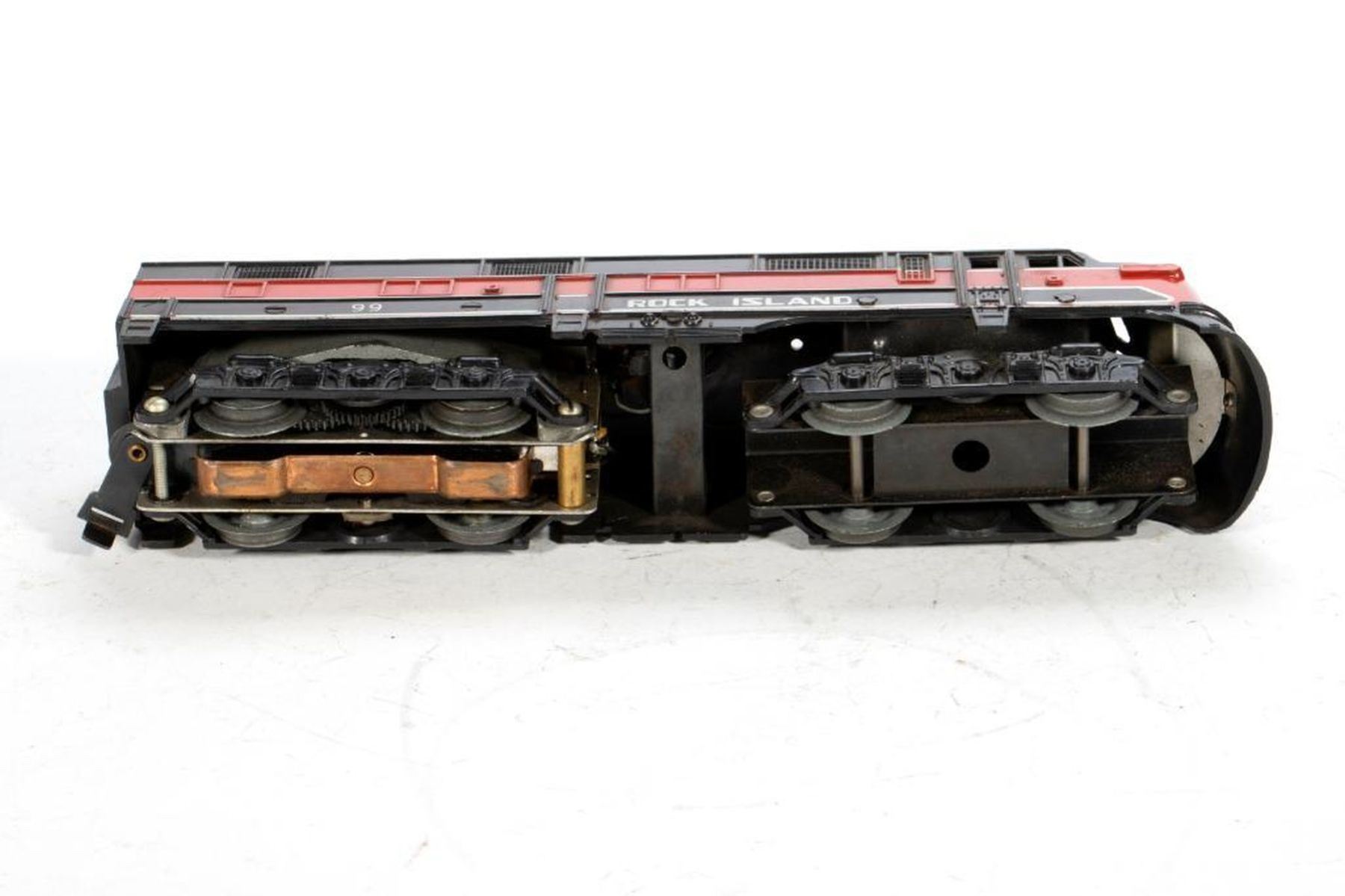 Marx 99 Lehigh Valley A Unit with all four corner steps and one horn. One inch chip on back top edge; Marx 99 Lehigh Valley A Unit missing right rear step, no horns, Front skirt has been cut out and a dummy knuckle coupler added to front truck; Lehigh Valley B Unit missing all corner steps, rust spots; Lehigh Valley B unit missing left front and right rear steps, rust spots; Lehigh Valley B unit with all four corner steps.